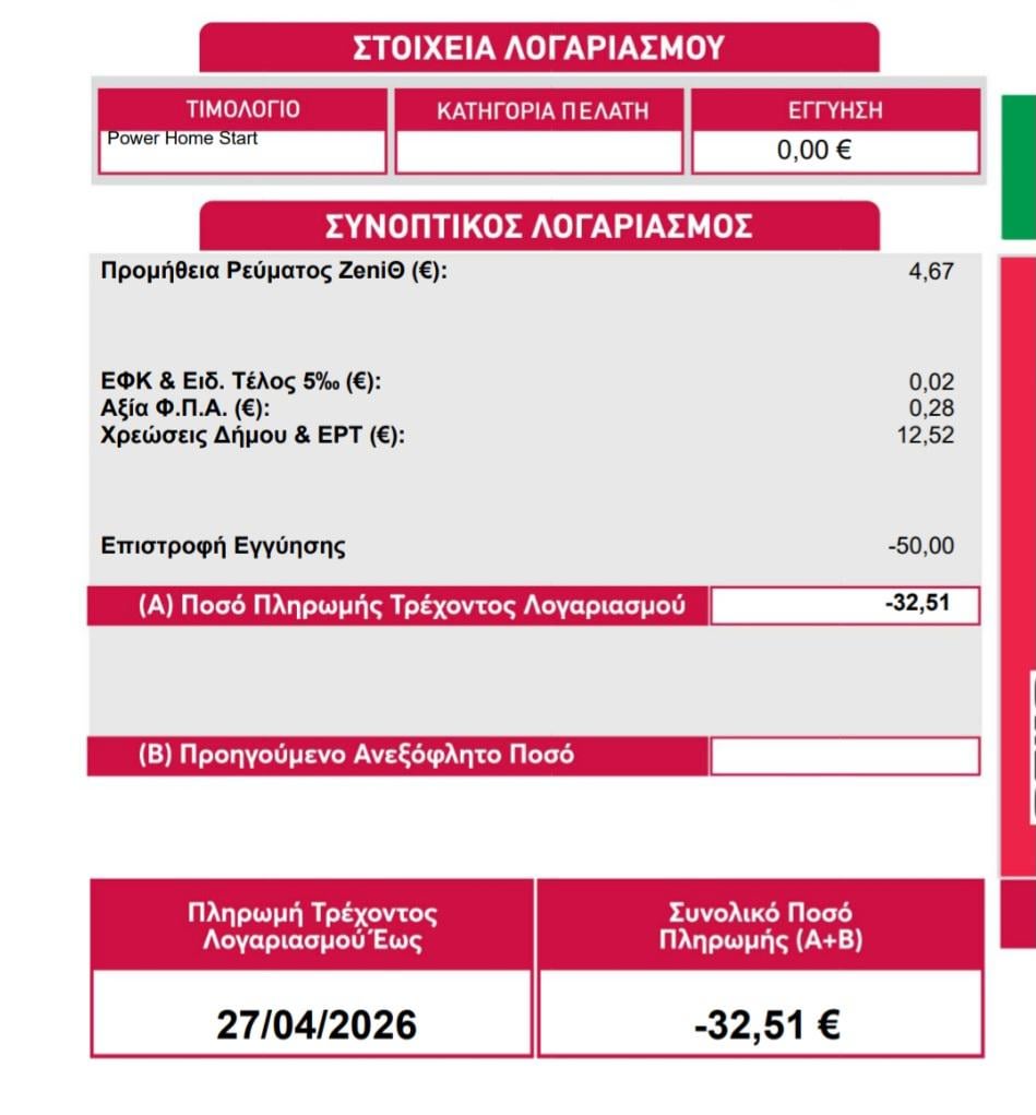 Πάντως στον λογαριασμό που ανέβασες, αναφέρει και “προμήθεια ρεύματος” στις χρεώσεις. Δεν είναι οτι σου έβγαλαν έναν λογαριασμό και έβαλαν απλά τα πάγια του Δήμου και ΕΡΤ. Ίσως σου έμεινε χρεωστικό για κατανάλωση ρεύματος ενός πολύ μικρού χρονικού διαστήματος μεταξύ της έκδοσης του προηγούμενου απο αυτόν λογαριασμού και της αλλαγής στον νέο πάροχο ρεύματος. Συμβαίνει αυτό όταν αλλάζεις πάροχο.