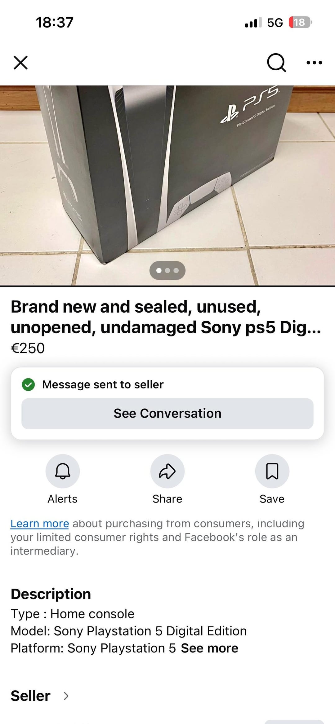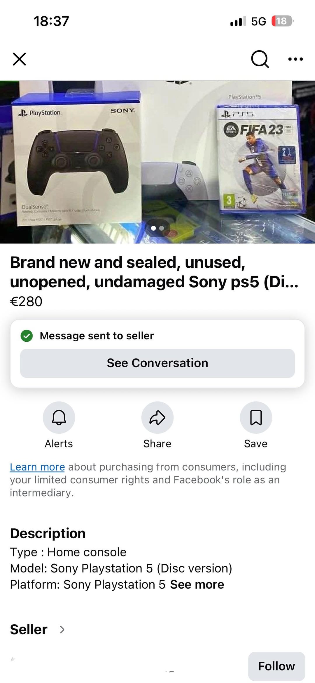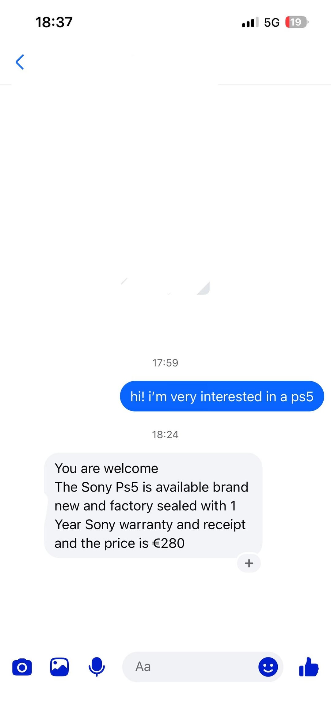 Dato che l’aumento ufficiale della console è dietro l’angolo, ho visto molti annunci nel Marketplace di FB che offrono PS5 a soli 250-280€, “nuovissimi e sigillati” e usano tutti la stessa struttura del testo (anche le due risposte fornite dalle due aziende che mi hanno risposto), il che è un po’ strano e confuso.