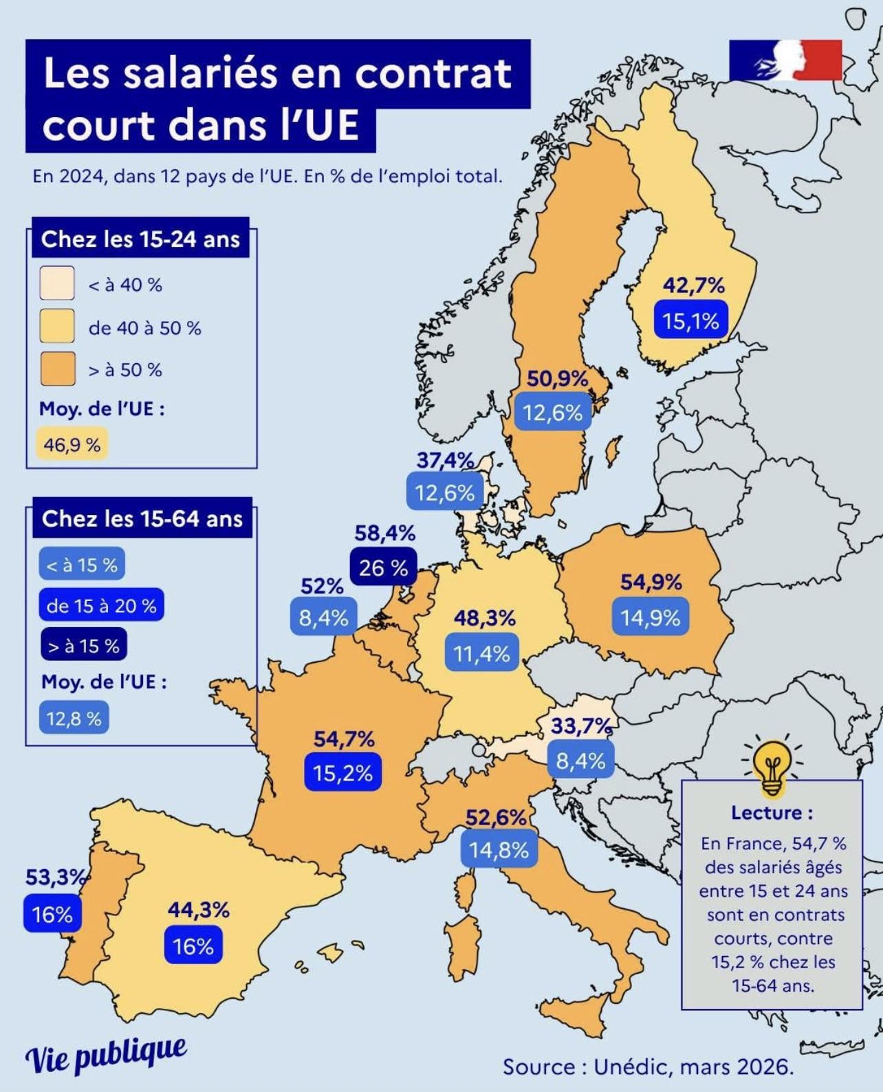 Les jeunes sont particulièrement touchés par les contrats courts. Sur les salariés dans l’UE âgés de 15 à 24 ans, près de 47% ont un emploi temporaire. »