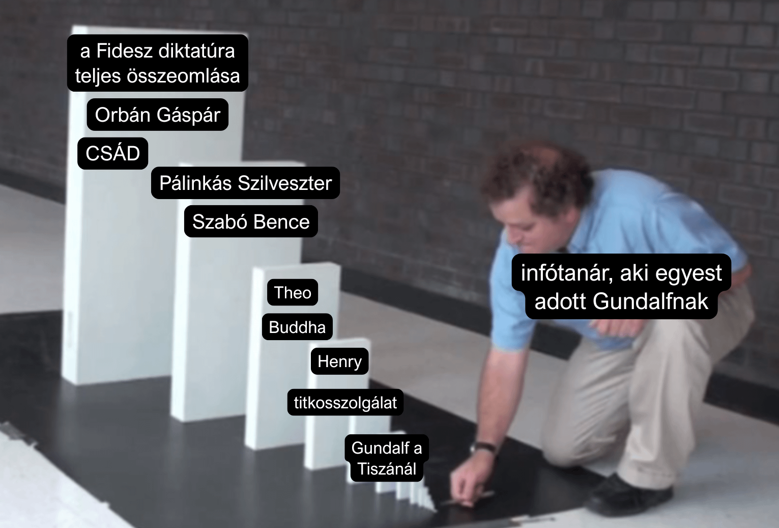 Plot twist, az infotanár időutazó. Visszajött egy olyan jövőböl ahol a fidesz nyerte a választást. Egyest adott Gundalfnak, hogy megváltoztassa múltat, így befolyásolva a választást, .a többi majd kiderül…