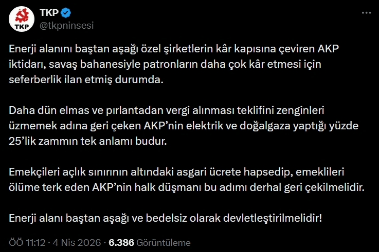 In reazione all’aumento dell’elettricità e del gas naturale, il TKP ha dichiarato che la mobilitazione è stata dichiarata per far guadagnare di più ai padroni con il pretesto della guerra e ha chiesto la nazionalizzazione del settore energetico.