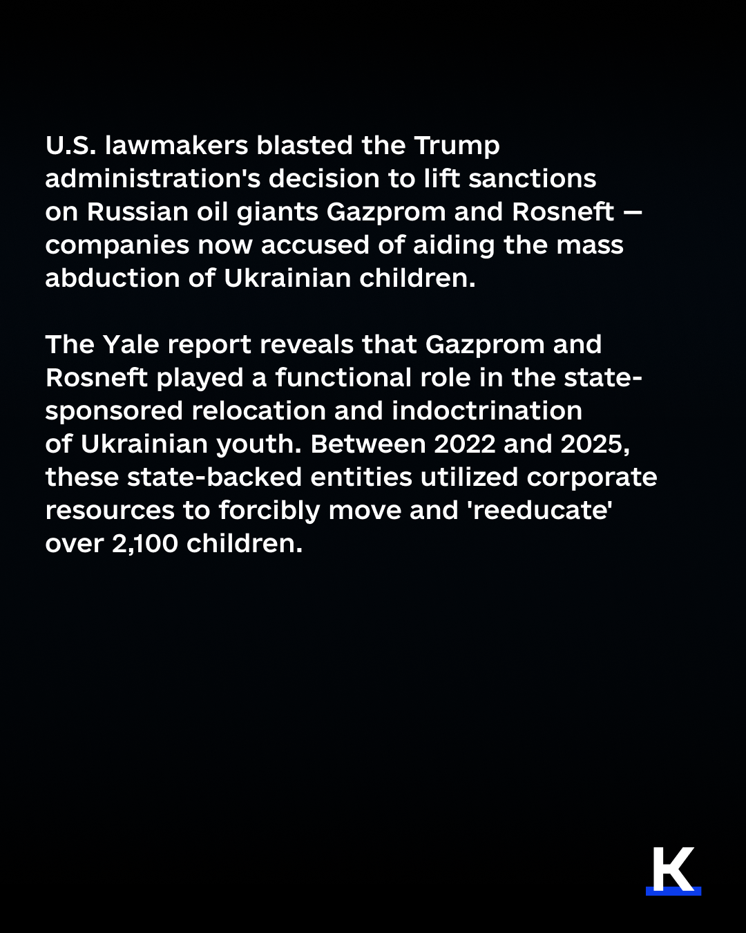 Il rapporto Yale, rilasciato il 25 marzorivela che Gazprom e Rosneft hanno svolto un ruolo funzionale nel trasferimento e nell’indottrinamento dei giovani ucraini, sponsorizzato dallo stato. Tra il 2022 e il 2025, queste entità sostenute dallo Stato hanno utilizzato risorse aziendali e strutture di proprietà controllata per spostarsi forzatamente e "rieducato" oltre 2.100 bambini provenienti dalle regioni occupate, comprese le oblast ucraine di Donetsk, Luhansk e Zaporizhzhia.