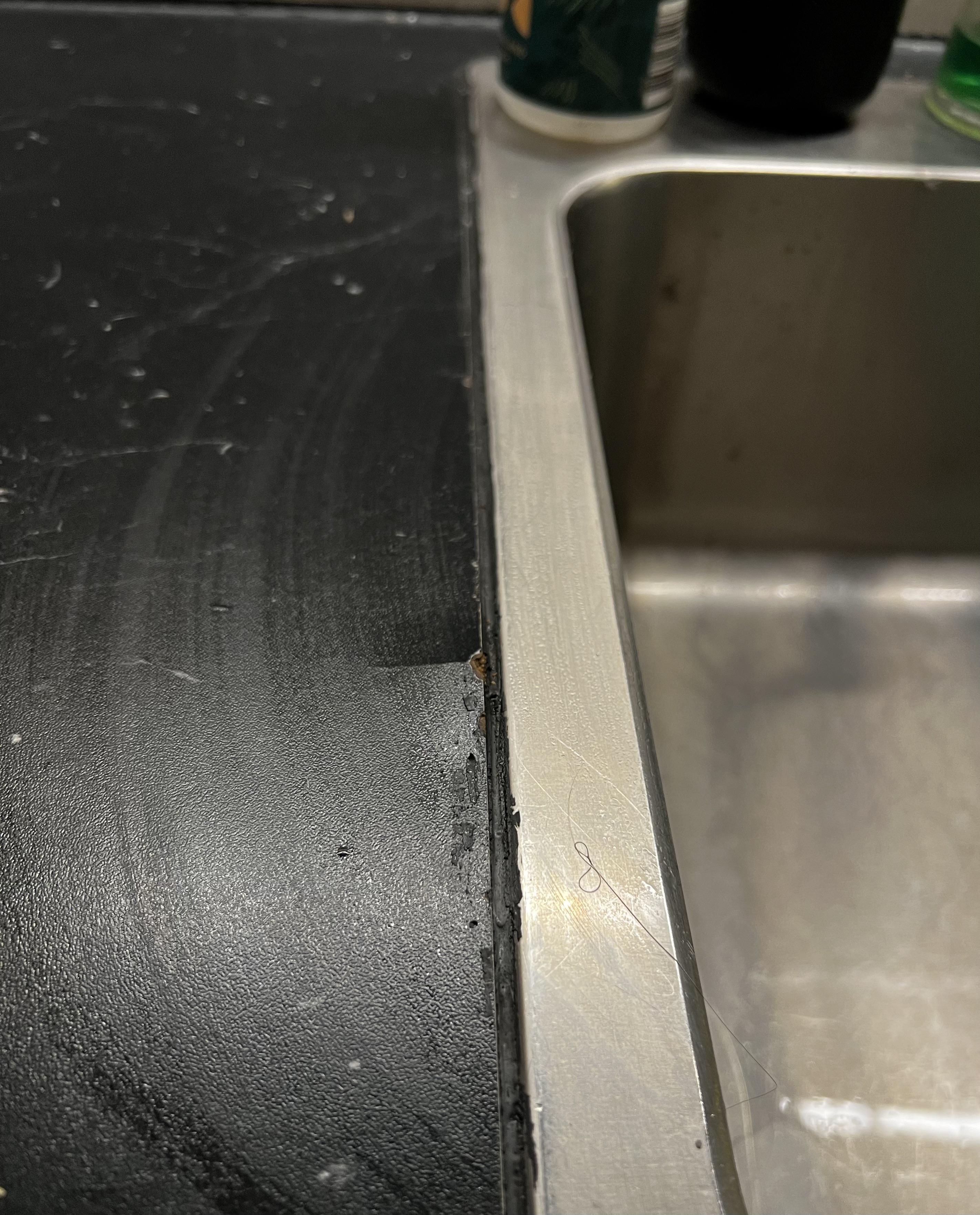 Jag har liknande skada i köket som jag lyckats stoppa expansionen av med snabbtorkande lim. En rejäl dos i klykan och torka av med papper så håller det ett tag