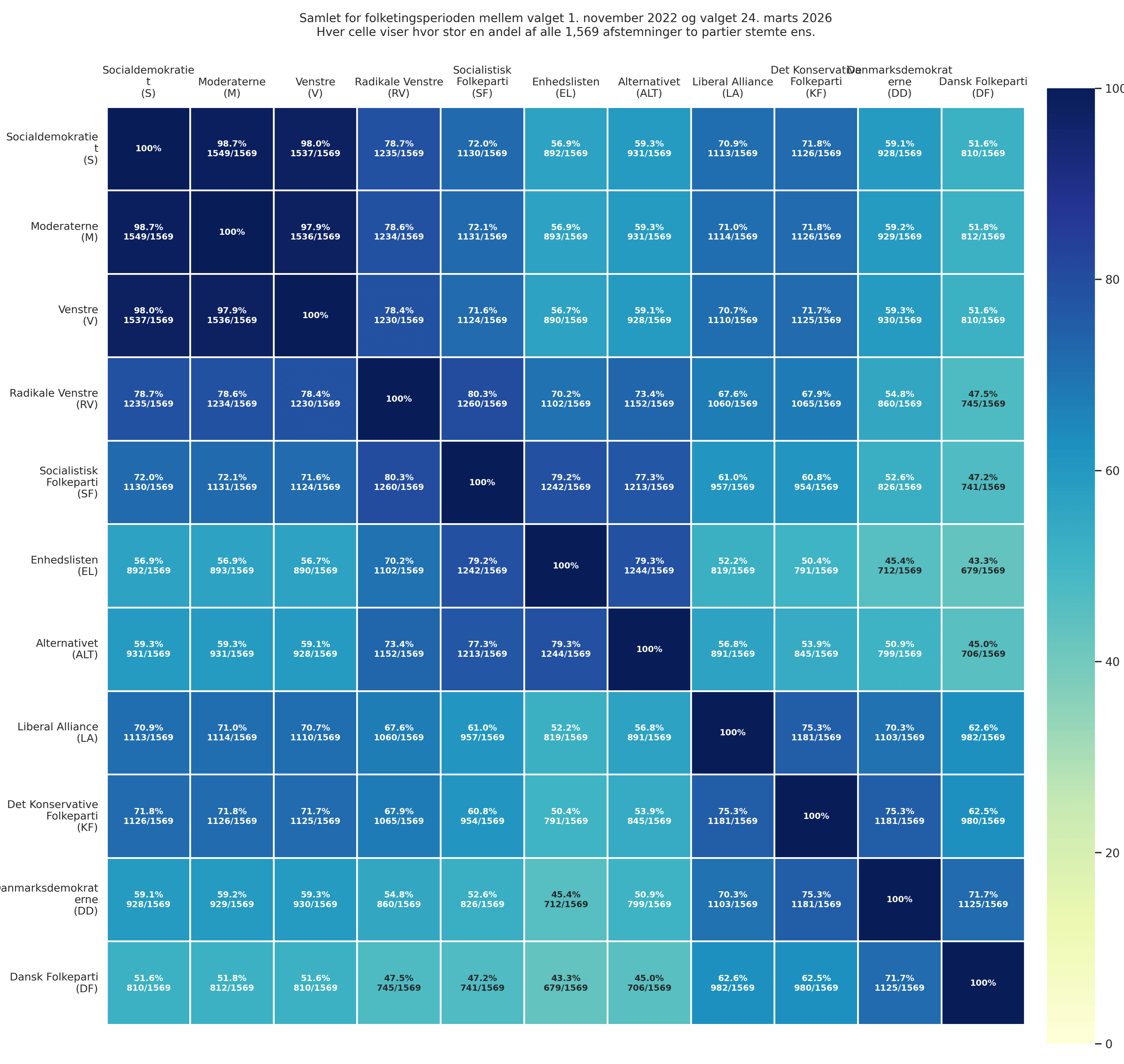 Calcolo della frequenza con cui diversi partiti votano allo stesso modo per l’ultima votazione parlamentare dal 2022 al 2026.