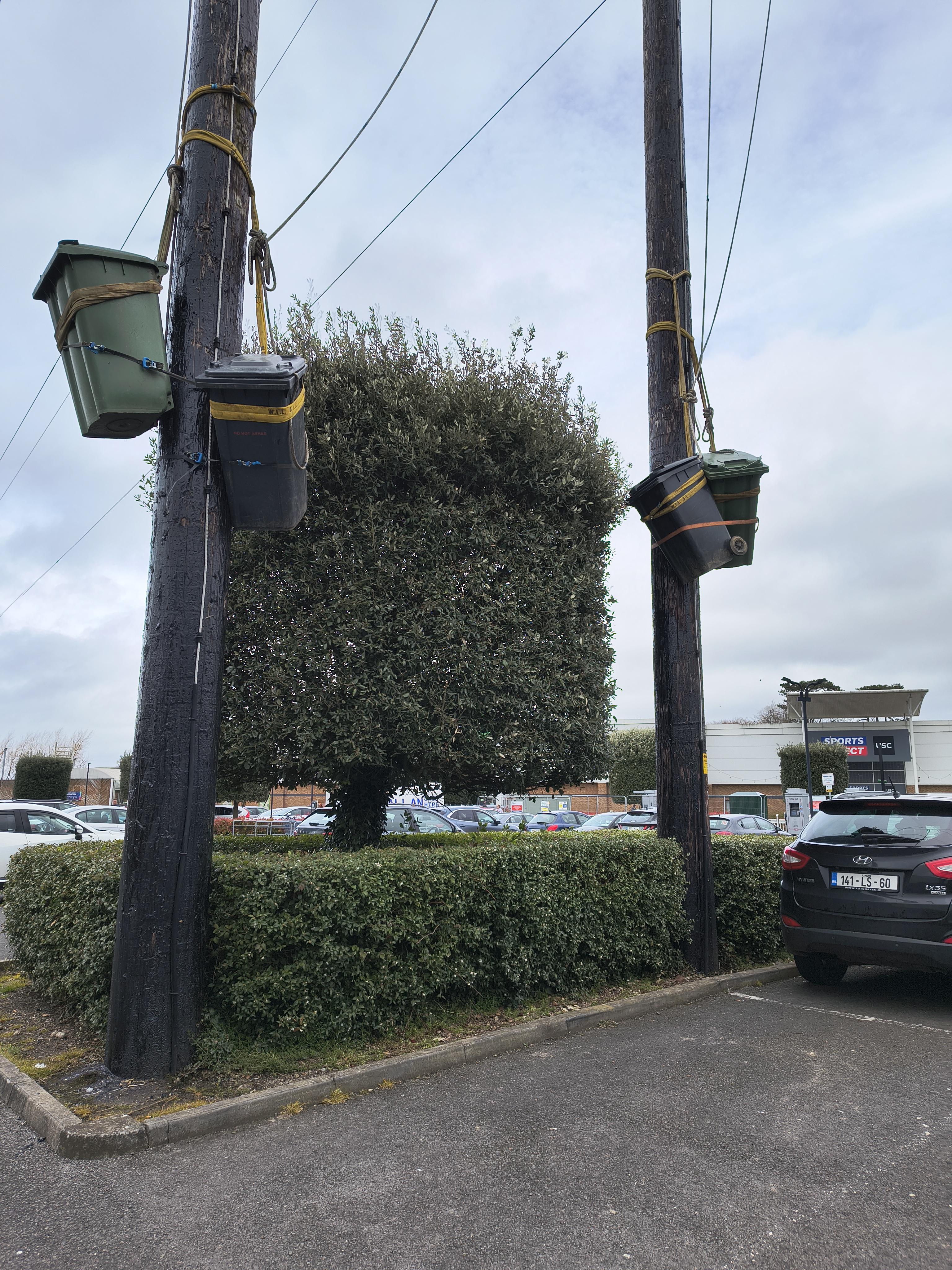 weird, is there cables going into the bins ? I’ve spotted similar stuff to this as a temporary solution to storing some monitoring hardware for traffic cameras maybe the ESB is doing something similar with some electrical monitoring hardware. Strapping them up high on the poles instead of just padlocking the bins is a new one though.
