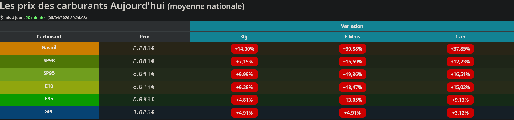 [ Il y a environ 15 jours](https://www.reddit.com/r/france/comments/1s03tlv/les_prix_des_carburants_aujourdhui_moyenne/), j’avais publié le même post. Depuis, les prix ont évolué, le gazole a augmenté de +0,123€, le SP de ~+0,04€, le E10 de +0,029€, le E85 de +0,014€ et le GPL de +0,043€.
