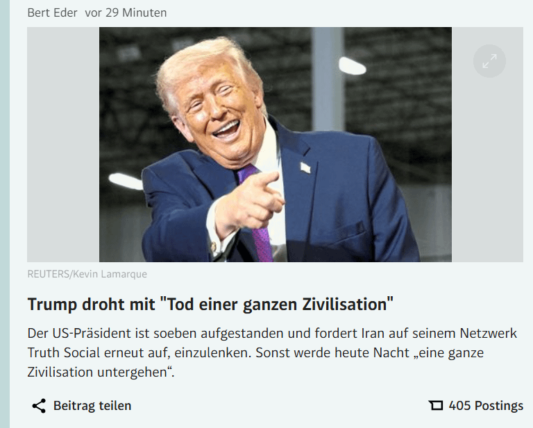 Na ernsthaft, wie oft hat Trump jetzt in diversen Themen, obs Zölle, Ukraine, NATO/Grönland, oder eben jetzt Iran waren, irgendwelche roten Linien gezogen und dann erst ignoriert oder Deadlines nach hinten geschoben? Ich halt das US Regime zwar schon für bekloppt genug, was dummes zu tun (nuklear eher weniger), aber tendenziell wird Trump mal eher wieder einen Post auf Truth Social raushauen wie sehr die Iraner nicht um Waffenstillstand und/oder Friedensabkommen betteln und deswegen sind die weiteren Militärschläge on hold. Dann wird sich zwar wieder der Iran melden und sagen es gab nichtmal Gespräche, aber Trump hatte immerhin eine Ausrede für seine eigenen Anhänger, warum er nicht tatsächlich mal durchziehen muss nach seinen Drohungen.