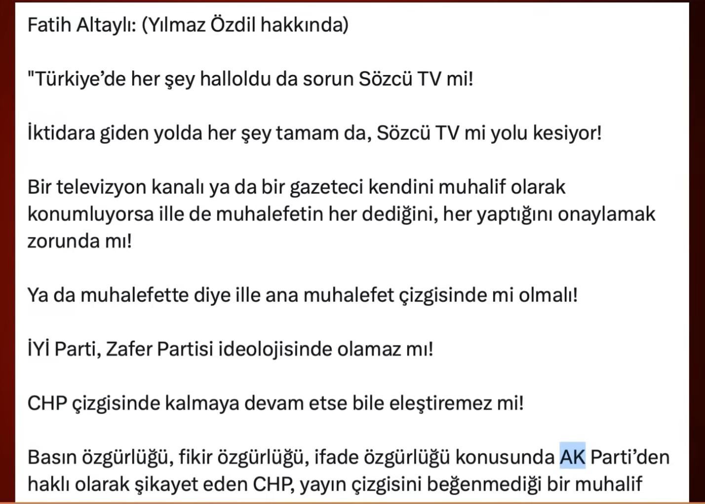 Edit: muhalefete muhalefet elbet edilebilir, ben kendim düzen partilerine ve kurumlarına muhalefet eden biriyim. Bunun yolu dedikodu yolu ile saçma sapan taş atmak değildir. Ya müesses nizama topyekün karşı durursun, ya da yapılacak eleştiriyi çözümler ve veriler ile desteklersin. Ayrıca sözcü tv aşırı izlenme oranı kaybetti özdil yüzünden, kanal yönetimi bunu göze alarak bu kararı vermiştir. Özdil hep yaptığı gibi mağduru oynuyor. işten çıkardığı basın emekçilerine söylediği gibi: Ağlayacaksa oynamasın…