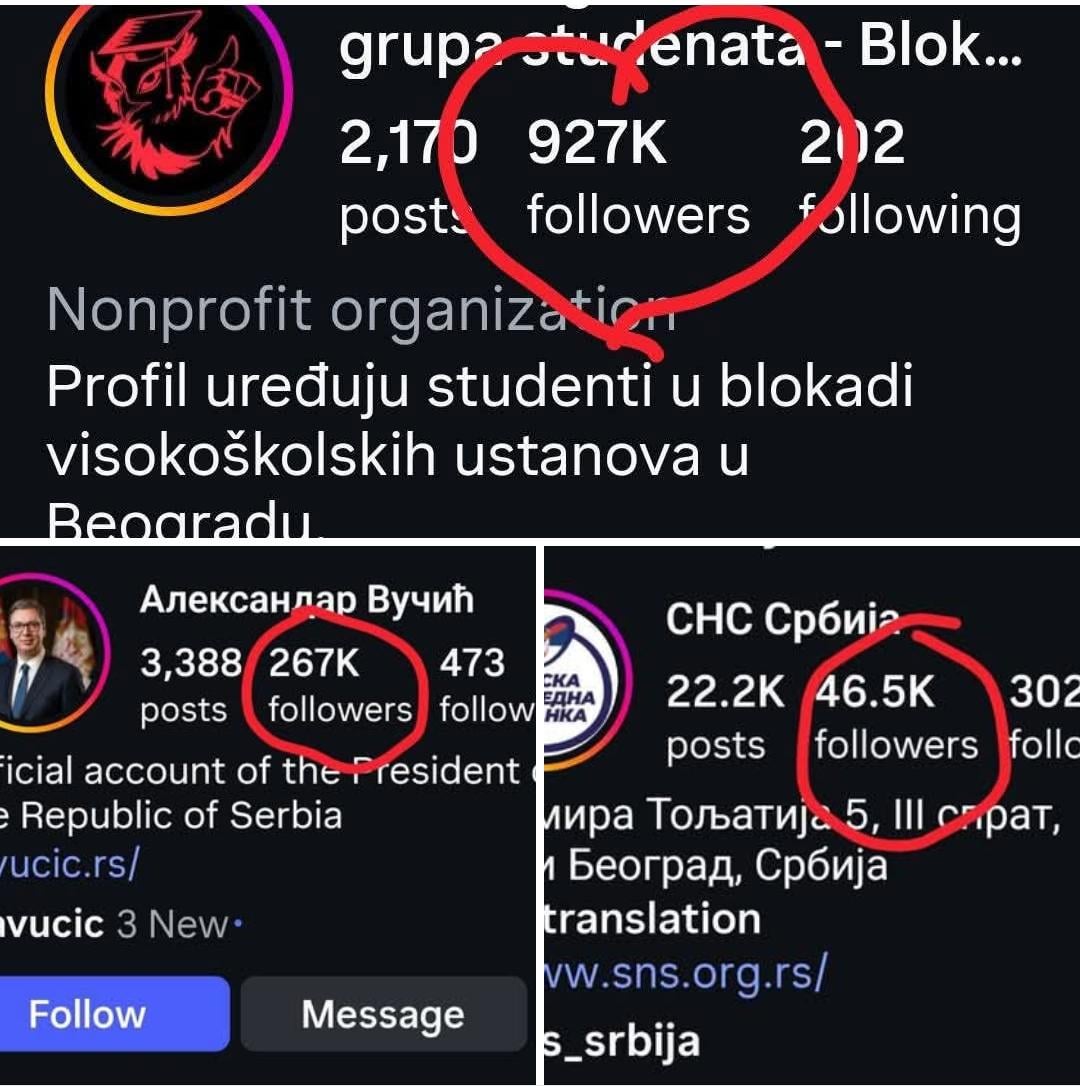 Realna brojka je oko 400k kod studenata. Sns im je kupovao pratioce u jako velikom broju u nadi da će im meta ugasiti profil.