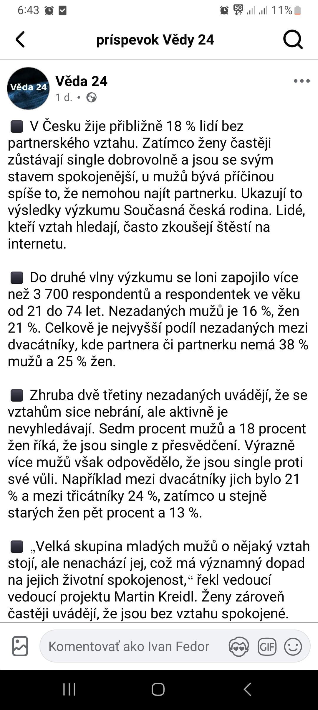 Tak ono je průzkum a průzkum… kdyby udělali průzkum z r/czech tak by zjistili že těch single lidí není 20 %, ale 50 %.