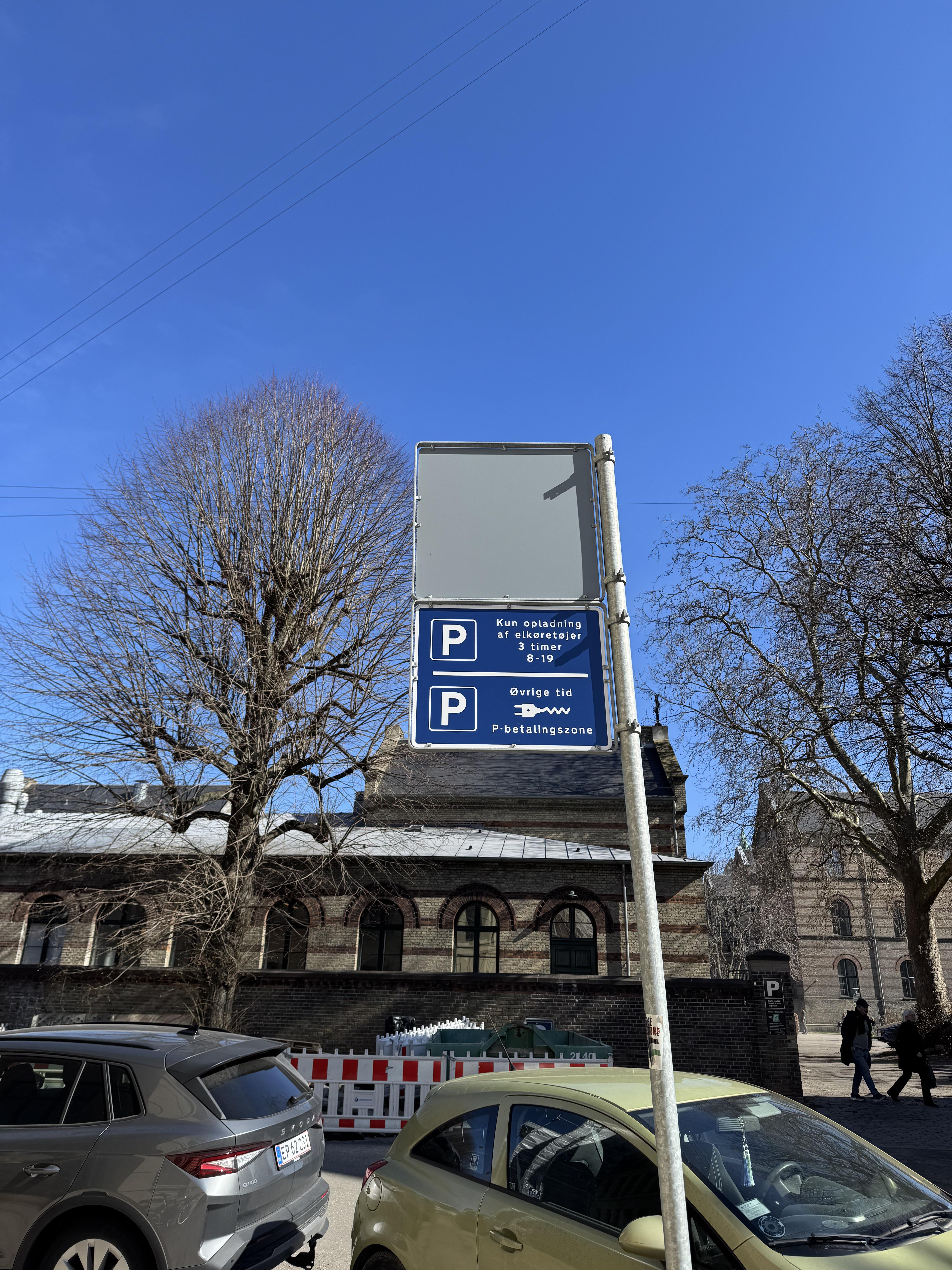 Nederste tavle fortæller at du øvrigt tid må parkere hvis du har Elbil og samtidligt betaler (P billet / beboer licens)