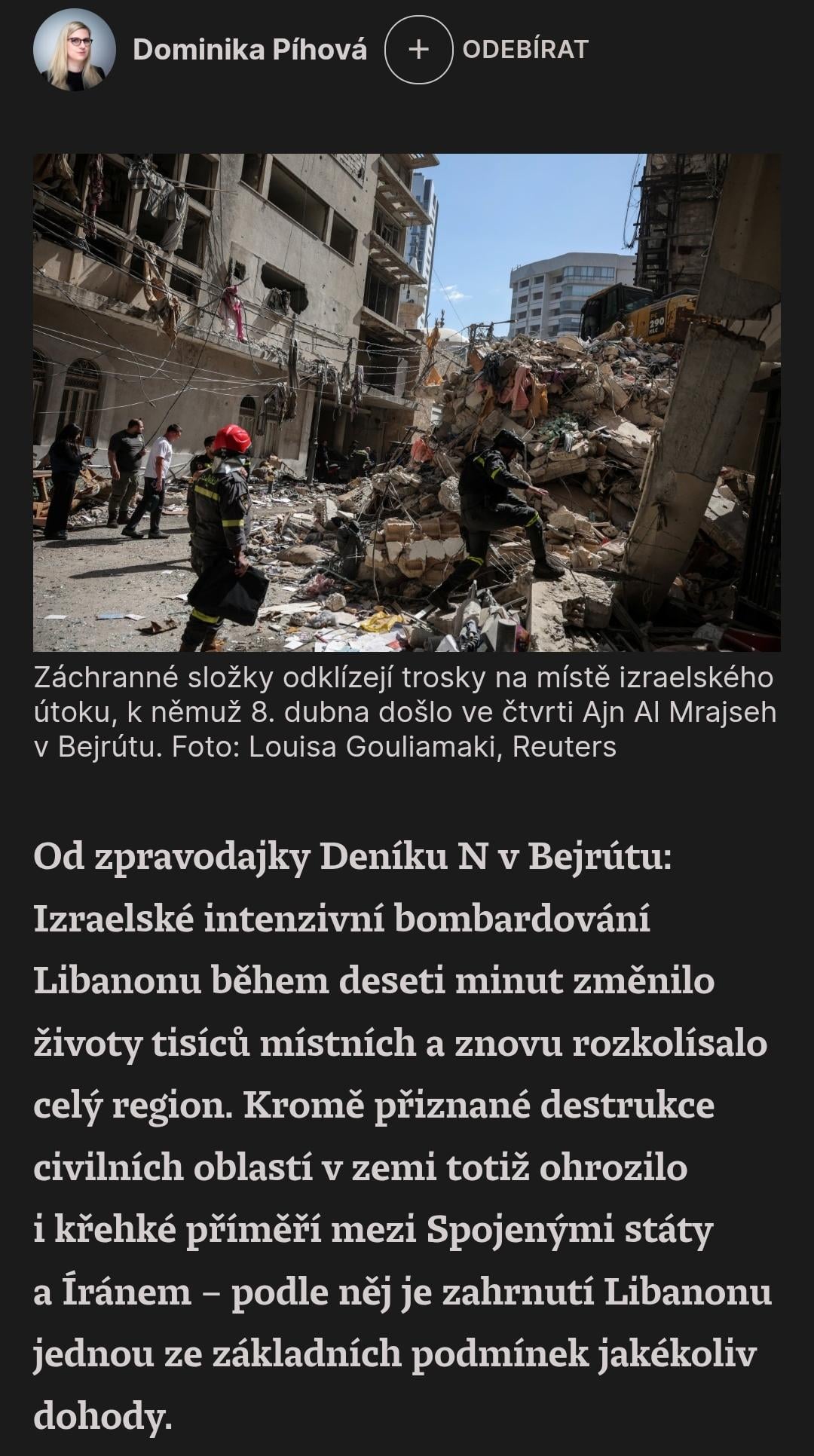 Já si nemůžu pomoc, ale Izrael už se fakt nesnaží řešit věci s minimem civilních obětí a s rozumem. Jejich nesmyslně obří buffer zone (čti zabírání území Libanonu a Sýrie), genocida v gaze a snaha zpustošit Írán co to jenom jde překračuje hranice. Netvrdím, že okolní ortodoxní arabáši nejsou velkej problém, ale Netanjahu je úplně mimo a likviduje Izraelskou reputaci stejně, jako Trump tu Americkou.