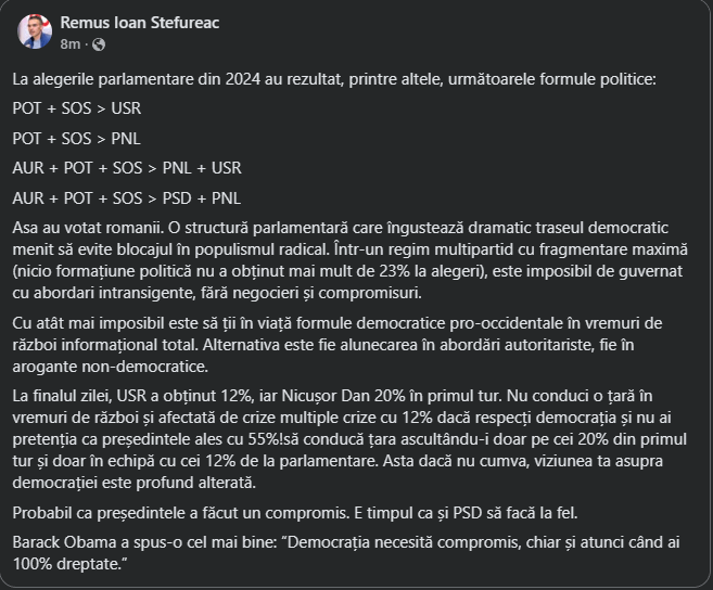 Ba cat de prosti sunt unii. Efectiv uite d-aia suntem in halul asta, din cauza abordarilor de o cretinatate mondiala ca “Nicusor a facut un compromis. E timpul sa faca si PSD la fel”. HOTULE TE ROG SA NU MAI FURI! UITE, EU AM LASAT DE LA MINE, LASA SI TU! Da frate, asta e strategia castigatoare. Sa discutam frumos cu hotul, sa-i explicam ca nu e ok. Sunt absolut convins ca dupa ce le-a numit toti procurorii, PSD acum o sa faca sedinta si o sa spuna Grindeanu “Ba baieti, uitati ce ok a fost Nicusor cu noi. Hai sa-l lasam si noi pe Bolojan sa ne mai taie din beneficii. Sau macar sa-l lasam pe Nicusor sa numeasca niste baieti ne-corupti la servicii.”