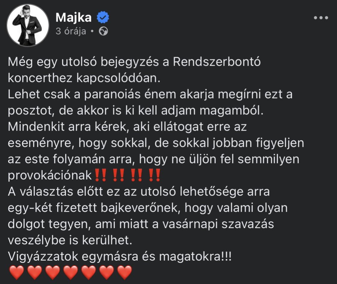 Kövezzetek meg, de szerintem baromság ez a rendszerbontó koncert… értem én, hogy jót tesz a hangolódás, de ezen a rendszerváltás sokkal nagyobbat bukhat, mint amekkorát nyerhet. Aki elmegy szavazni, az nem a mai koncert miatt fog elmenni, ellenben lehet olyan nem kívánt zavargás, ami csak ártana.