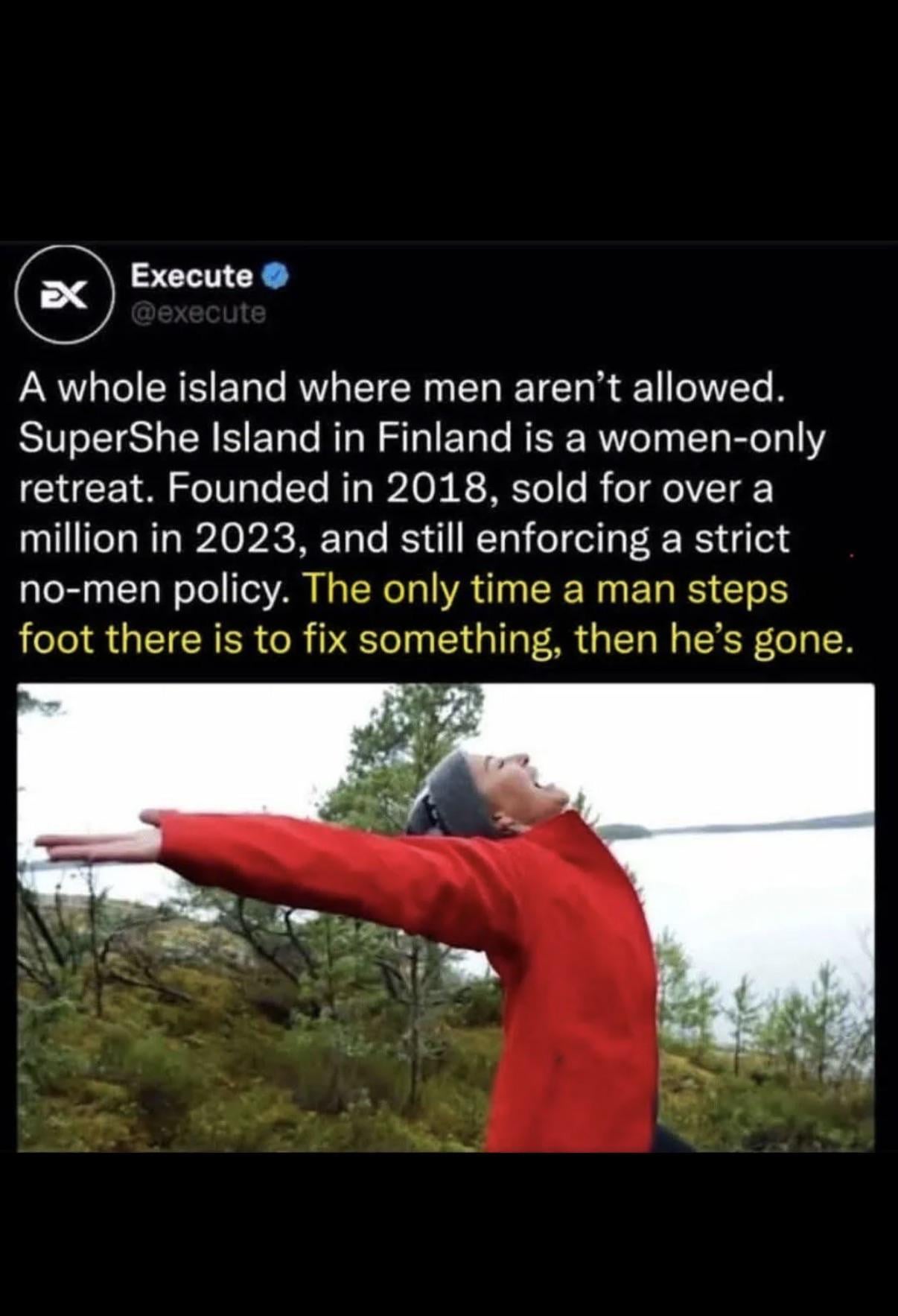Lmao here before the divorced middle aged men come shaking their fist in the air and loudly crying “Grr, a singular woman-only island in this country with over a 100 000 islands!? I AM BEING DISCRIMINATED AGAINST!”
