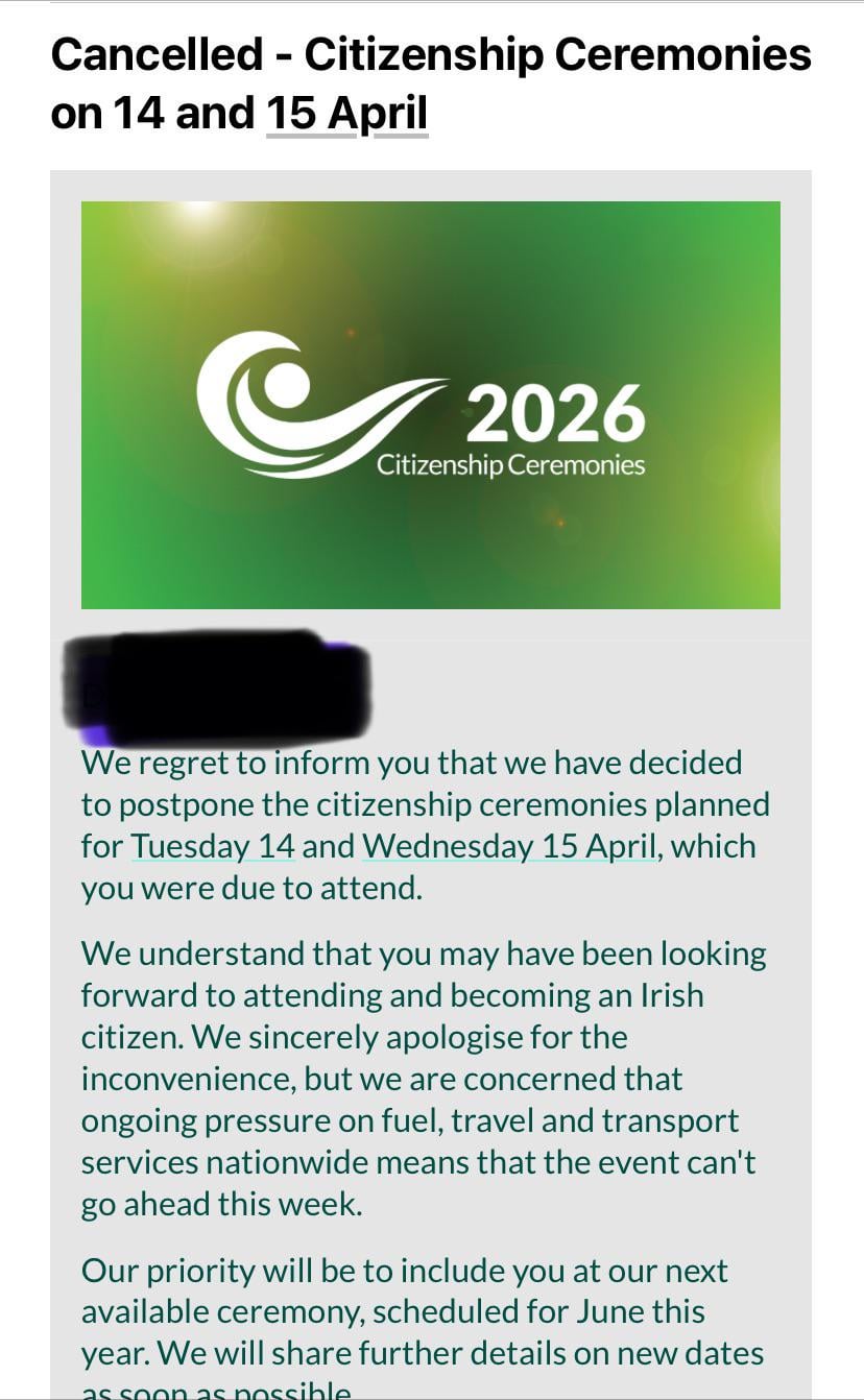 Sono devastato per questo. Ho ricevuto l’e-mail solo oggi alle 13:20. Domani mattina dovremo dirigerci a Killarney da nord-ovest. Perché finora stavamo facendo una piccola vacanza di 3 notti. Il preavviso è troppo breve per cancellare l’hotel, le ferie annuali e il dog sitter. Qualunque sia il denaro che avrò perso, sono semplicemente dispiaciuto di non aver ottenuto la cittadinanza martedì mattina. Questo è stato un grosso problema per me e, ne sono sicuro, per molti altri. Cancellarlo completamente quando molte persone sarebbero in grado di partecipare è una follia. Sono sicuro che anche Killarney subirà un grande colpo.