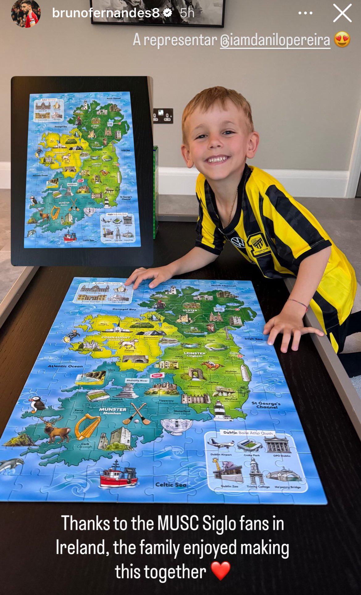 Bruno Fernandes pubblica la foto del puzzle dell’Irlanda su Instagram, scrivendo Sligo come “Siglo”