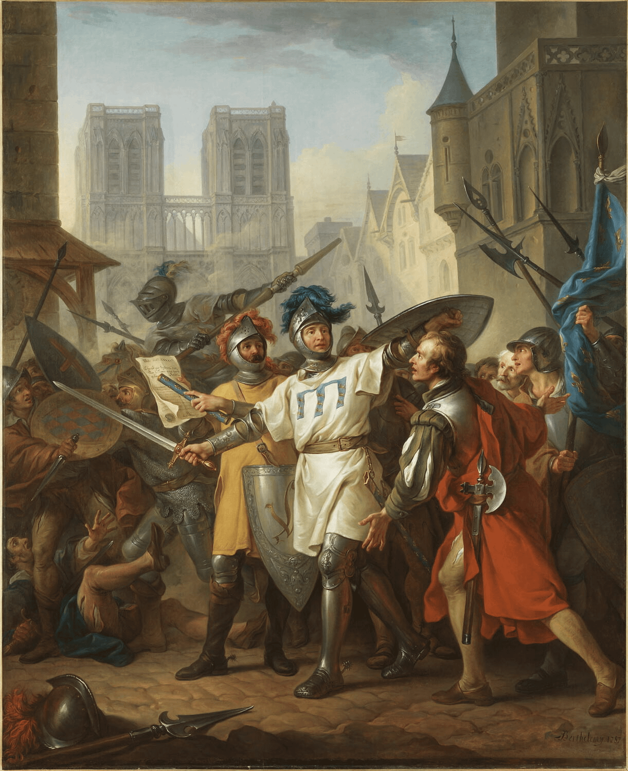 Simon Morhier, chevalier Français et prévot de Paris pour les Anglais, mena son bataillon dans le quartier des Halles. Là , il s’adressa à un ami, un riche meunier sur lequel il était certain de pouvoir compter. Son ami lui dit « Ayez pitié mon ami, il faut faire la paix maintenant, sinon nous sommes perdus. » « Quoi, vous aussi ? » répliqua Morhier, le frappant au visage avec le plat de son épée et le laissant se faire lyncher par ses hommes.