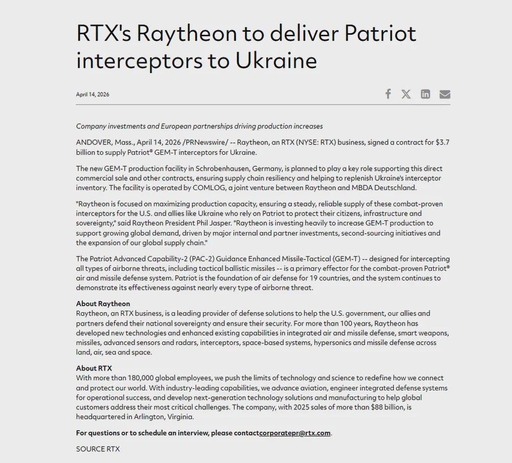 ❗️Raytheon has signed a $3.7 billion contract to supply Ukraine with Patriot GEM-T interceptor missiles, with Germany funding the acquisition. A new production facility in Germany will be a key element in supporting this agreement.