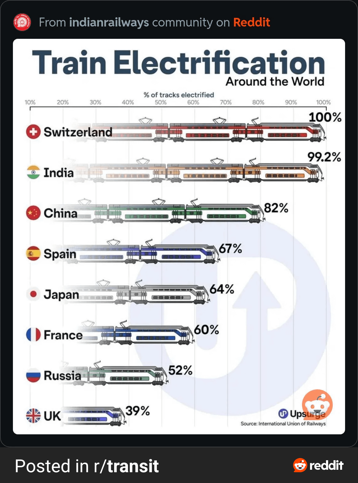 Batmanbacon on 14/04/2026 22:10 India at 99% is extremely impressive, especially when considering they have about 100 times more track than Switzerland