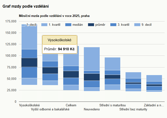 Ten graf je hrozne stupdni. Median ma byt jedna hodnota, ne nejaky rozptyl. Stejne tak prumer. Kdo definoval, ze prumerny plat je od 95k do 112k cca? 😅