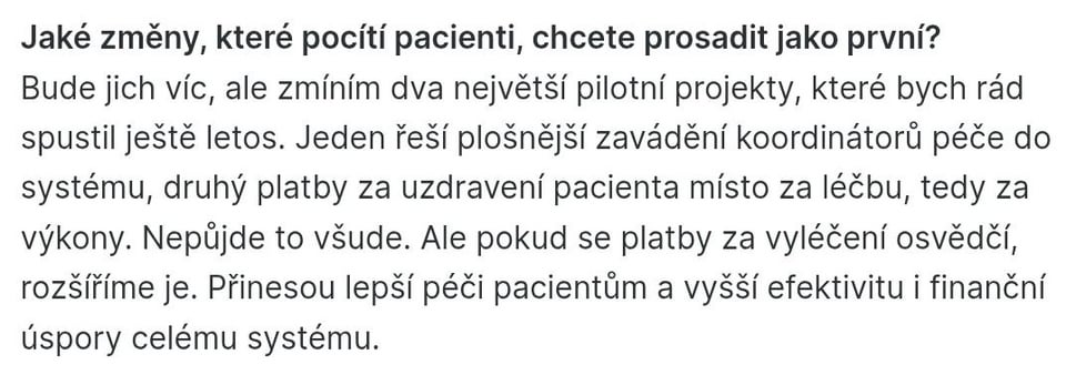 Co takhle si to přečíst? Jednak mluví o tom, že to lze využít jen v některých oborech a potom konkrétně jmenuje. Např. ortopedie a výměna kloubů, kdy nemocnice dostane za výměnu např. kyčle jeden balík peněz a případné reoperace už se navíc hradit nebudou. Což je velmi dobrá motivace, než někomu dělat kyčel na 3x, protože pojišťovna zaplatí všechny 3 implantáty a všechny 3 operace. Navíc to podle zkušeností že zahraničí funguje.