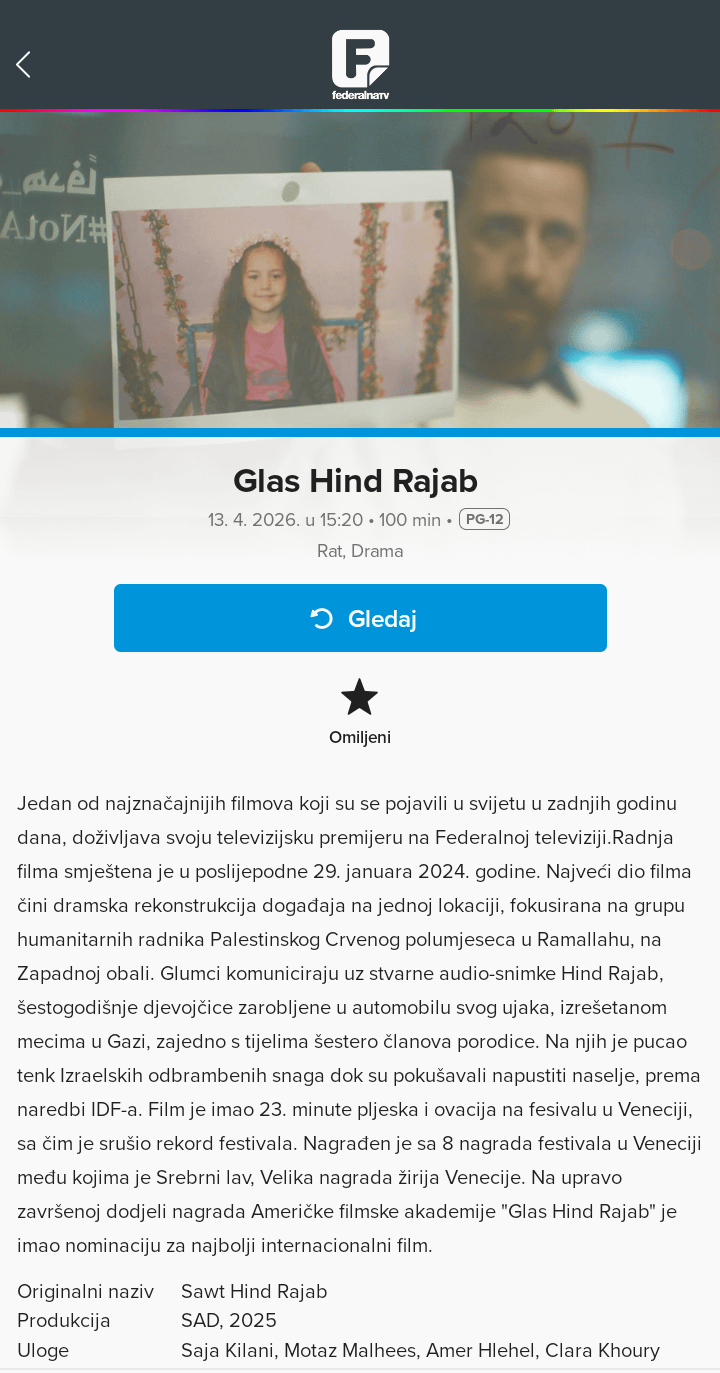Broad_Success_5458 on 15/04/2026 13:23 Vrijedi pogledat definitivno. Po istinitom dogadjaju je pravljeno, zaista tuzna i potresna prica koja pokazuje brutalnost desavanja u Palestini.