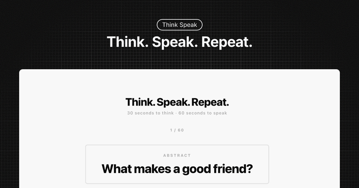 Ho creato un piccolo sito web in cui ottieni parole o argomenti casuali, pensi per un momento e poi ne parli. Nessun accesso, nessuna configurazione, basta aprire e iniziare a esercitarsi: https://thinkspeak.vercel.app/ di itguygeek