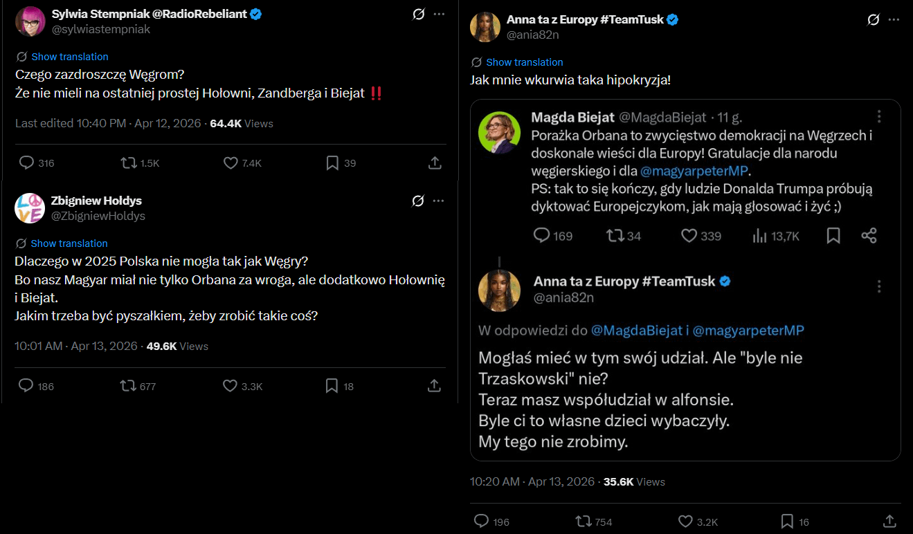 Najśmieszniejsze, że nic z tych wyborów nie zrozumieli. Podają je jako przykład sukcesu “jednej wspólnej listy” (w domyśle anty-PiS), podczas gdy taka koncepcja właśnie przyniosła opozycji węgierskiej porażkę w **poprzednich** wyborach. W tych “dawna opozycja” praktycznie nie brała udziału (poza cetrolewicową Koalicją Demokratyczną, która wylądowała pod progiem z marnymi coś 1,5%), a Tisza była nową partią (fakt, że również z udziałem pewnych dawnych polityków, ale poprzez akces indywidualny), zaś sam Magyar jest byłym politykiem Fidesz.