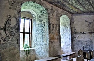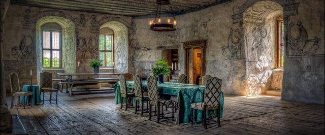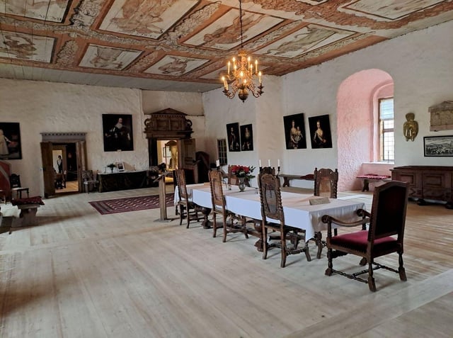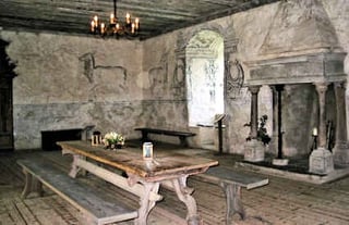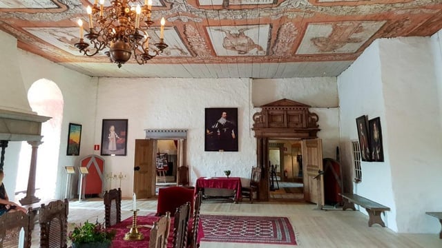Immagine 1: Casa in pietra Torpa in una soleggiata giornata estiva. Immagine 2: immagine dell’atmosfera magica. Immagine 3: Incisione del castello con i dintorni nel XVII secolo da Suecia antiqua etholderia di Erik Dahlberg. Immagini 4 – 9: Interni con l’altare della cappella nell’ultima immagine.