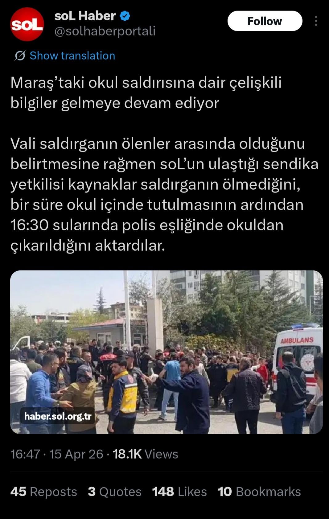 Presumibilmente l’aggressore di Kahramanmaraş non si è suicidato. È stato portato fuori vivo dalla scuola dalla polizia.