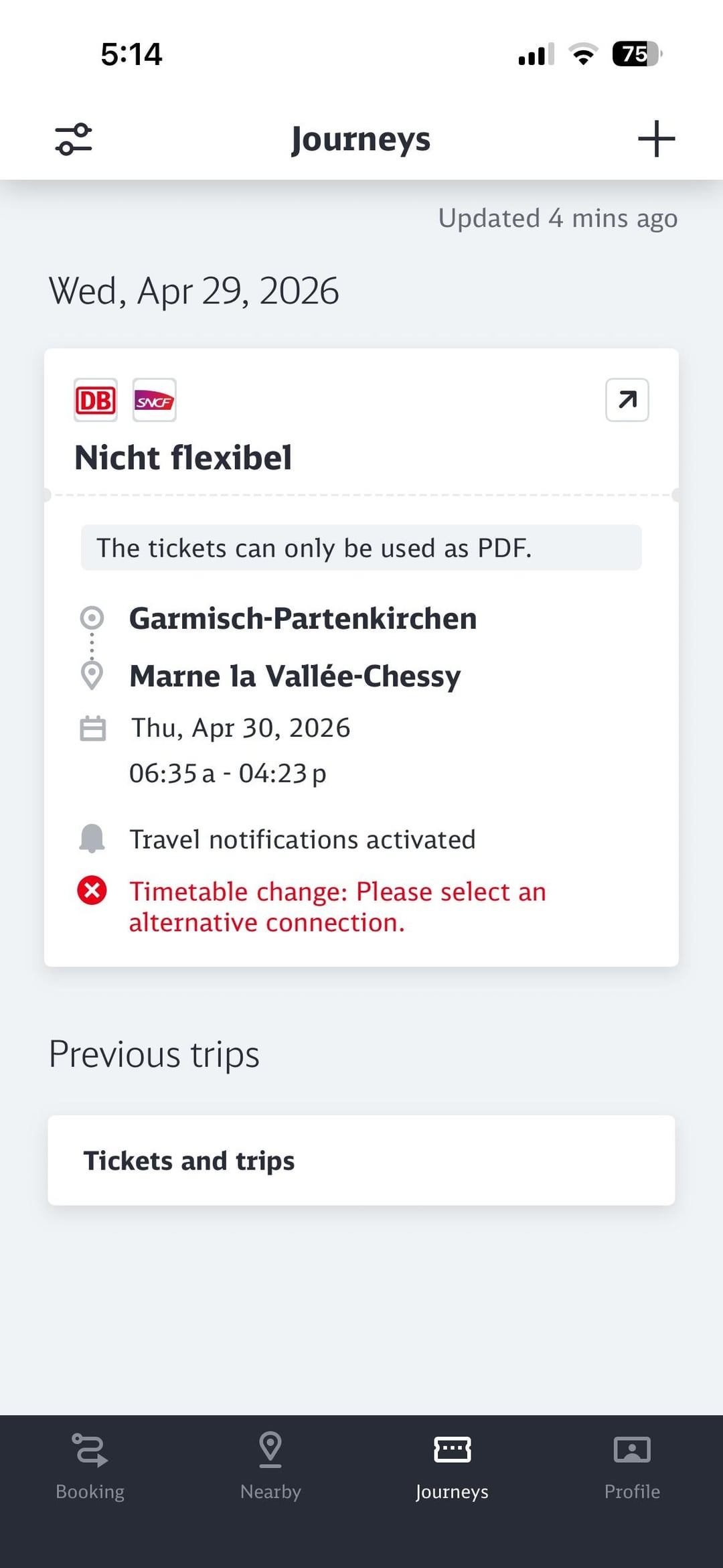 Prenderemo una coincidenza di treni da Garmisch-Partenkirchen, Germania a Marne la Vallée-Chessy, Francia il 30 aprile.