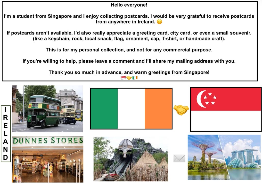 Sono uno studente di Singapore e mi piace collezionare cartoline. Sarei molto grato di ricevere cartoline da qualsiasi parte dell’Irlanda. 🙂