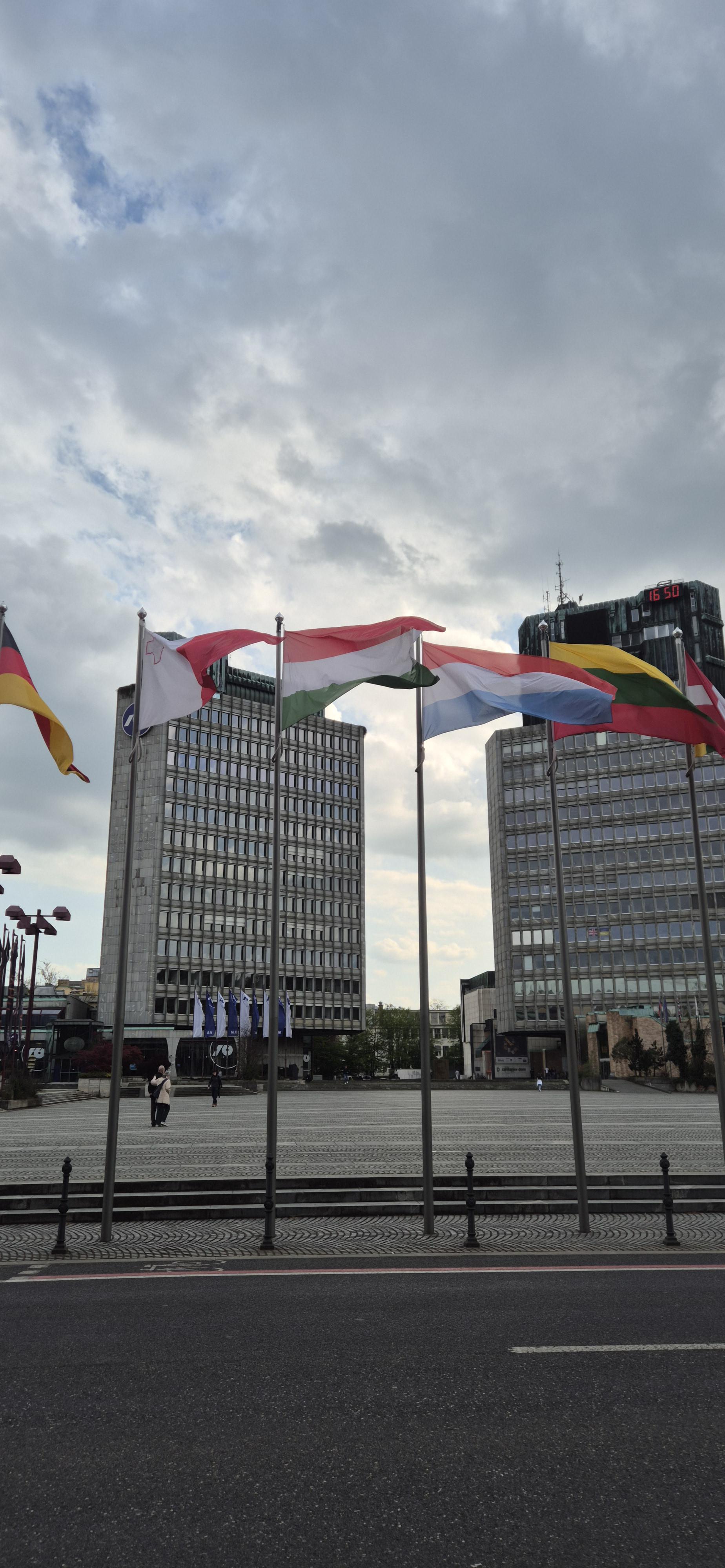 The square actually has all of the EU member states flags, plus the flag of the EU and the flag of Ljubljana. And behind the photo is the Slovene parliament