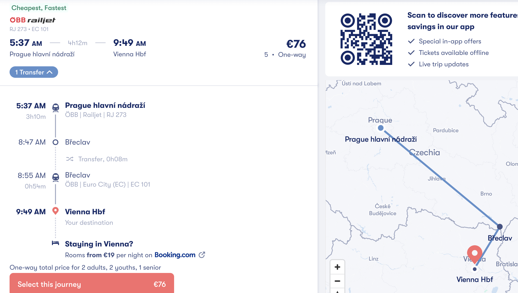 Il treno precedente è questo, delle 5:37 con un trasferimento di 8 minuti a Břeclav. Il successivo è alle 6:37 senza trasferimento. Stesso prezzo, compagnia e stazioni.