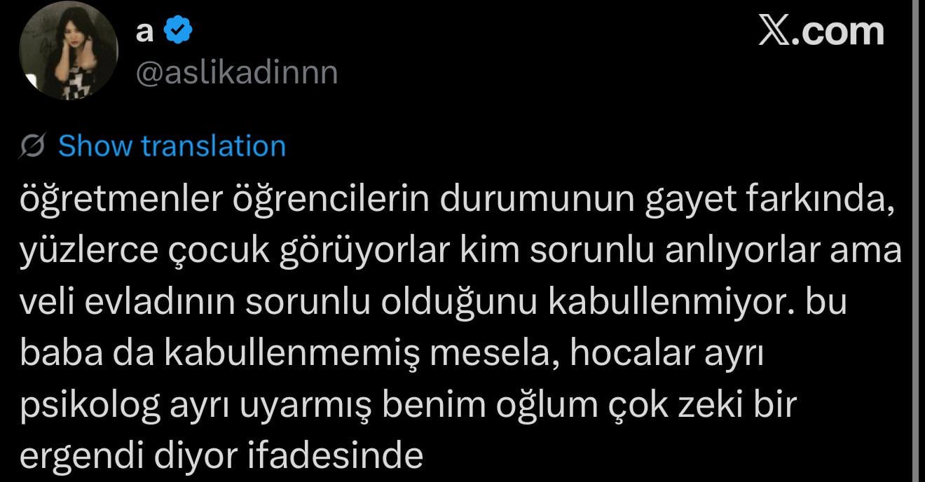 Questo sistema è crollato nell’incidente di Kahramanmaraş di ieri. Il ragazzo, secondo me, non è una persona meschina. Il genitore non insegna nulla al bambino. Non frega niente. L’insegnante non riesce a tenere il passo con nulla perché fa da babysitter a 40 persone e allo stesso tempo insegna.
