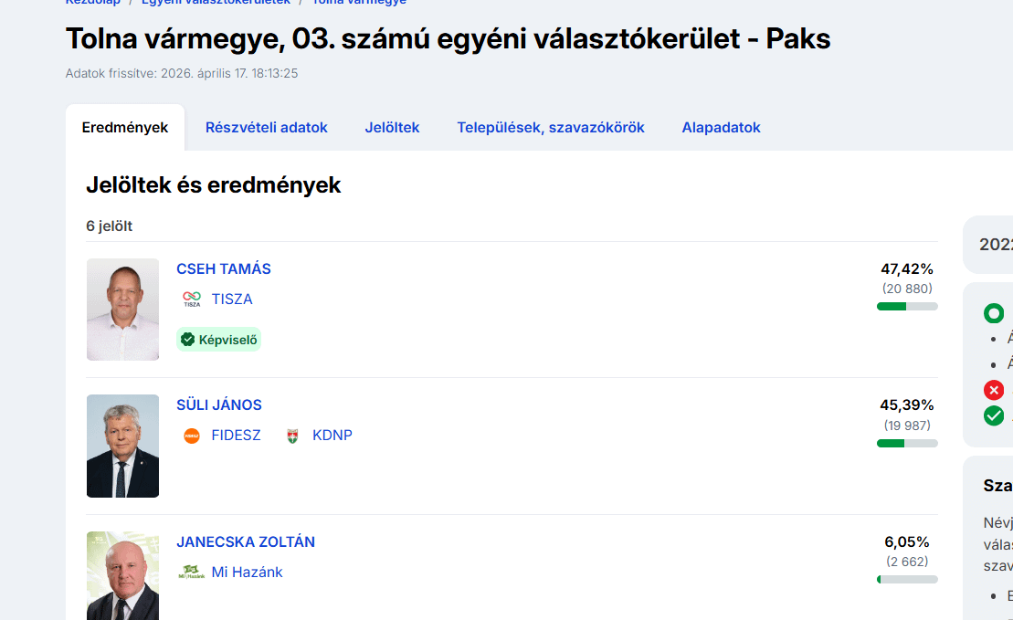 Cseh Tamás (Tisza) : 19338 szavazat (46,20%)