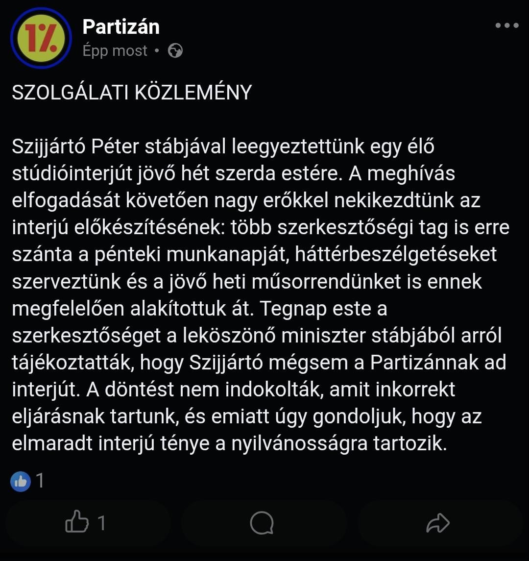 Szíjjártó ha detto a Telex che valuterà a quale giornale indipendente rilasciare un’intervista. Sospetto che pensasse che Marci sarebbe stato un avversario troppo duro per lui, quindi non lo vedremo nel Partizán.
