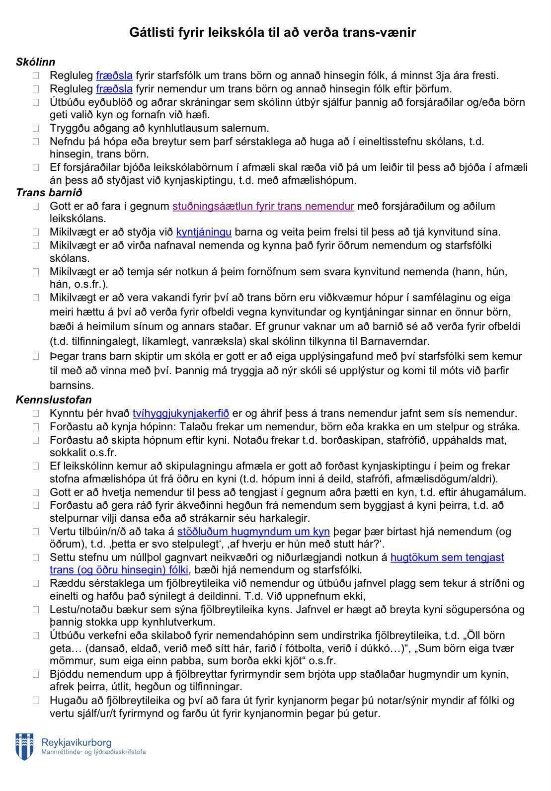 Jæja, lastu skjalið eða bara titilinn? Er þetta ekki bara frekar standard listi yfir hluti sem hægt er að gera til þess að kynjun sé minni hluti af upplifun barna í leikskólanum? Heldur þú að öll börn í leikskóla séu í bleyju og með snuð?