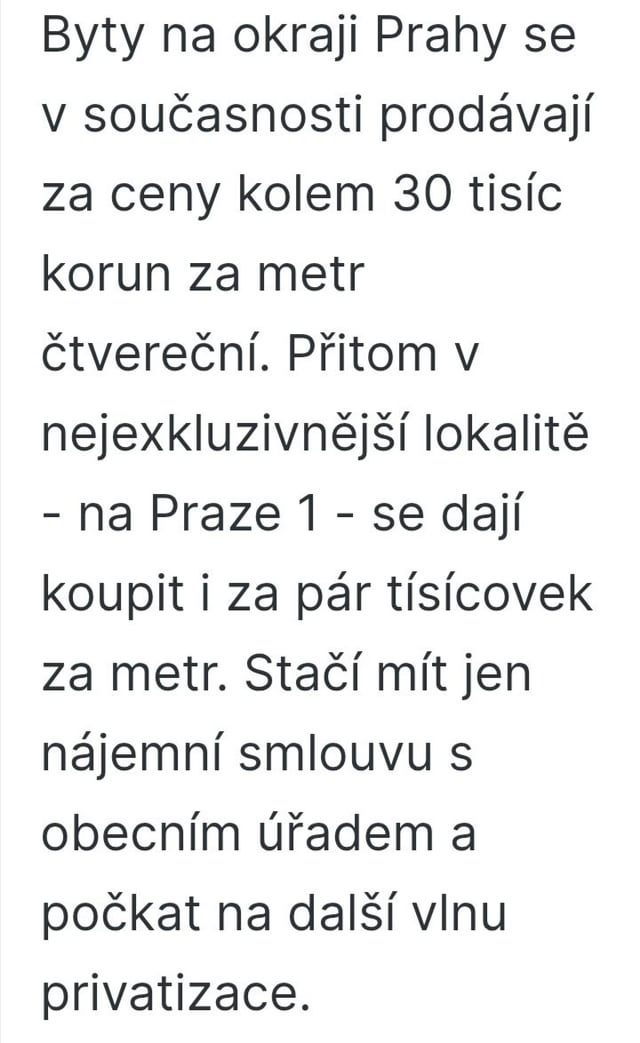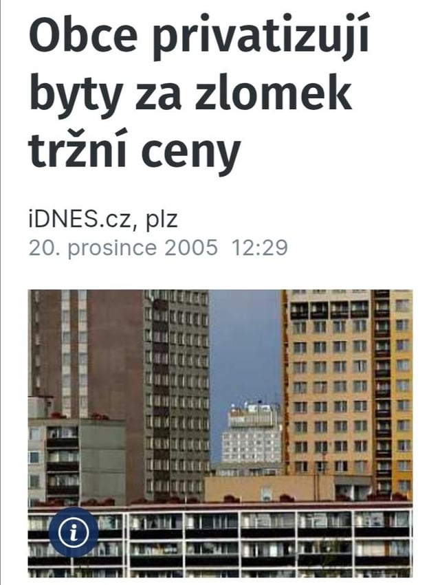 Poiché in ogni discussione sui boomers e sulla loro situazione abitativa negli anni 93-2007, mi imbatto in difensori profondi che sostengono quanto sia stato difficile per gli acquirenti, quindi ho voluto trovare i prezzi di vendita durante la privatizzazione sui siti web delle autorità. Purtroppo non c’è quasi nessuna possibilità, o le delibere sono già cancellate di proposito oppure solo dati con formule misteriose, ecc. Sono riuscito però a trovare un articolo d’epoca, che spiega magnificamente come questi superumani con un contratto di locazione fossero favoriti e spesso comprassero appartamenti per "10% del prezzo di mercato". L’articolo è del 2005, quando lo stipendio medio era di 17500! Tuttavia, gli estremi sono stati molto maggiori, soprattutto nelle piccole città. Esperienza personale in famiglia, quando nel 2003, con uno stipendio medio di 16.000 kc, si comprò dal Comune un appartamento per 45.000 kc e il prezzo di mercato era almeno mezzo milione, e oggi 3M. Un collega di lavoro a Praga in quel periodo 4+1 98 m per 800 t. Quindi, immagino. Quelli che a quel tempo avevano un contratto d’affitto dalla città furono i fortunati prescelti e arrivarono ad una grande proprietà a buon mercato. Le città si sono sbarazzate del 90% del loro patrimonio immobiliare e ora gridano che non ci sono appartamenti per le persone. Link all’articolo qui: