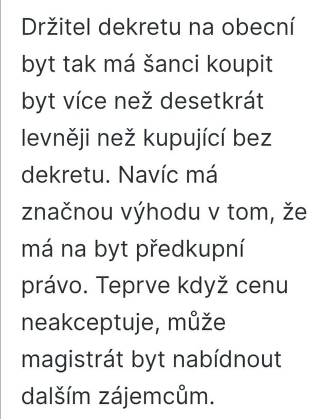 Hodně lidí mělo dekret na byt za to, že přenechali svůj dům nebo byt, případně jiný pozemek městu/státu za minulého režimu. Ti rozhodně neměli platit vůbec nic za takový byt.