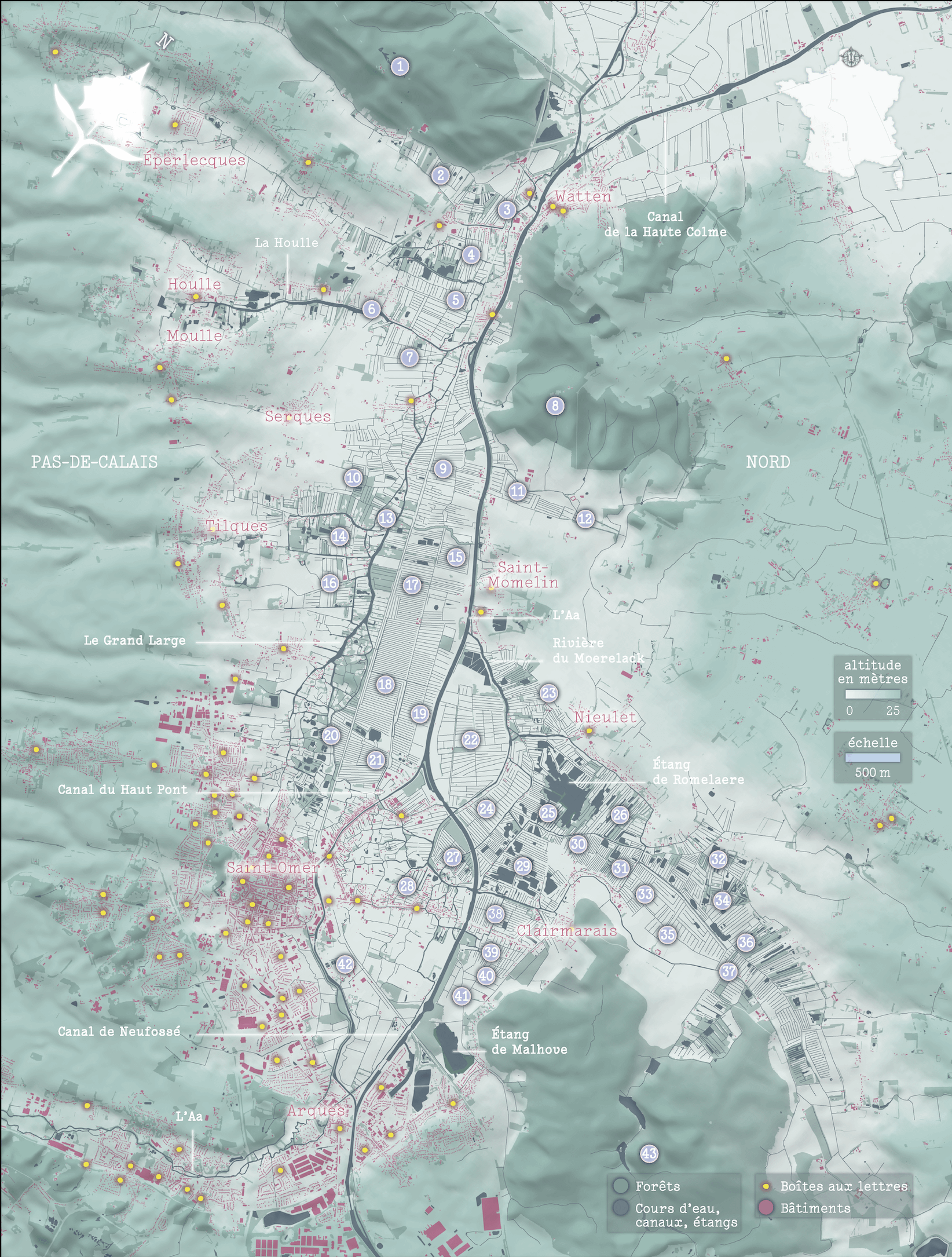 mydriase on 18/04/2026 16:06 Voici une carte tirée du chapitre du “Les enfants du Marais”, lui-même tiré du livre de “la France des Mille lieux” — nous sommes 4 auteurs dessus…! Le chapitre se propose d’explorer les marais et zones humides de France : Marais poitevin, marais de Kaw en Guyanne, la Dombes et d’autres encore, pour raconter ces lieux dans leur profondeur, leur richesse géographiques, toutes les histoires qu’ils portent aux creux de leurs courbes et de leurs sillons 🙂 >En ces temps incertains, traversés par des crises sociales et écologiques, en ces temps où le futur ne demande encore qu’à être dessiné, il est rassurant de se laisser surprendre par la rareté : Saint-Omer, ville assise sur le marais Audomarois dans le nord de la France, est du nombre. La ville trône sur de vastes canaux façonnés par les sociétés humaines depuis le xii^(e) siècle. Sur les parcelles cultivées, des champs et des exploitations maraîchères travaillent à l’autonomie alimentaire du territoire, tandis que des parcelles jardinées émergent des maisons aux briques rouges contrastant joliment avec le bleu paon des méandres du marais. L’eau, la terre et la brique forment à Saint-Omer une danse commune. Dans les quartiers parsemés et isolés du centre-ville, le facteur livre toujours le courrier en barque. Il est rassurant de le voir ainsi naviguer. Il n’a besoin pour cela ni de carte, ni de GPS, car le dédale des canaux, il le maîtrise depuis longtemps. Il y trace son chemin grâce à un petit moteur et s’oriente par les courbes et recoins d’un paysage connu et aimé, façonné par plusieurs générations d’Audomarois. Chemin faisant, il arrache une herbe encombrante, libère un passage, fluidifie la circulation de l’eau. Son acte n’a rien d’anodin car, aux endroits que lui seul traverse, il est gardien de la bonne santé des canaux où sommeille une biodiversité aussi exceptionnelle que le marais lui-même : cormorans, choucas des tours, hérons cendrés, grèbes huppés ou encore espèces rares de chauves-souris. Mais là ne s’arrête pas sa fonction. Le facteur est également un soutien pour les personnes âgées que leur corps fatigué isole des lieux de sociabilité. Son arrivée est célébrée : il livre une carte, un courrier, mais aussi un morceau de conversation, un sourire, les nouvelles de la ville, une petite attention, une présence. Le facteur et sa barque sont vecteurs de lien dans ce milieu où c’est l’eau qui permet aux habitants de se rencontrer : ils connectent le centre et la périphérie, la maison individuelle et les hauts quartiers, Saint-Omer au reste de la France. Au fond, dans chaque lettre, le facteur délivre bien davantage qu’un bout de papier : il dépose dans les boîtes aux lettres toutes les couleurs du marais. je mets un petit [lien](https://www.editions-ulmer.fr/editions-ulmer/la-france-des-mille-lieux-vers-un-reenchantement-cartographique-1045-rem-cl.htm) ici pour ceux qui aimerait découvrir cet atlas insolite, entre manifeste géographique et livre de voyage fantastique et ré-enchanté… Le livre fait le paris d’explorer les milieux de notre pays (d’où le titre) avec en axe central la géographie culturelle qui a beaucoup d’enseignements précieux mis en cartes et textes dans notre travail !