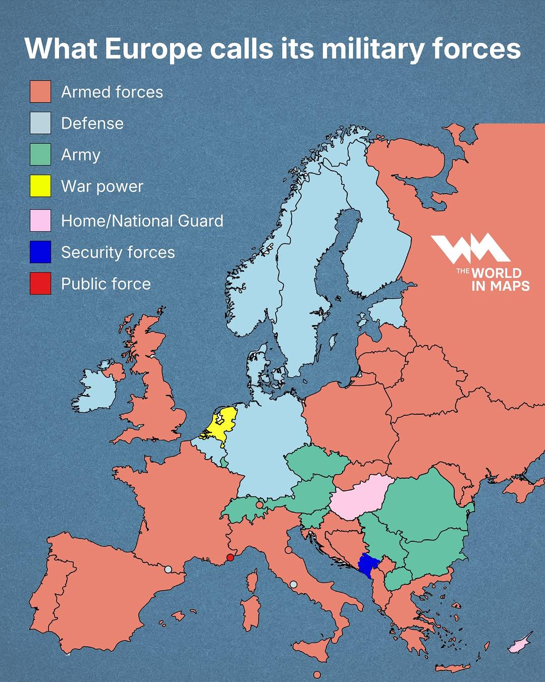 Mappa che mostra come ogni nazione d’Europa chiama ufficialmente le proprie forze militari. https://i.redd.it/b3pav8byfvvg1.jpeg di Citaku357