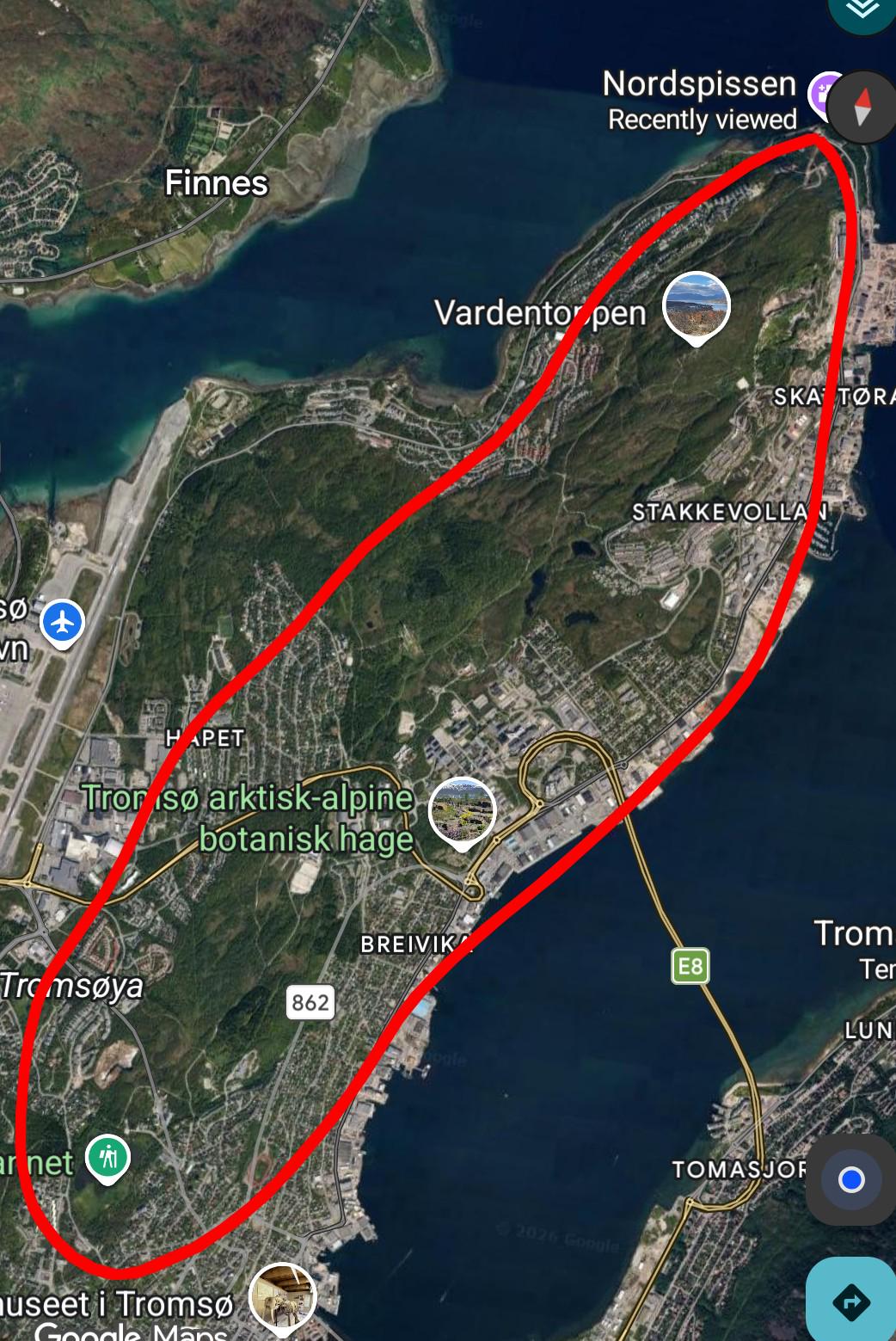 I would rather recommend doing the hike on the south tip of Tromsø island rather than north because there is no sidewalk on the north tip from Hamna to Skattøra, and Skattøra is just an industrial shithole.
