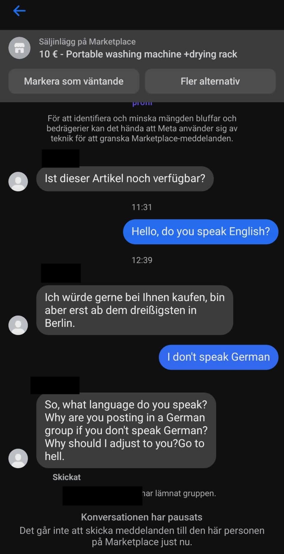 Anmäl det i appen och gå vidare. Jag bor också i Tyskland och man blir rätt less på dem. Världens tråkigaste människor.