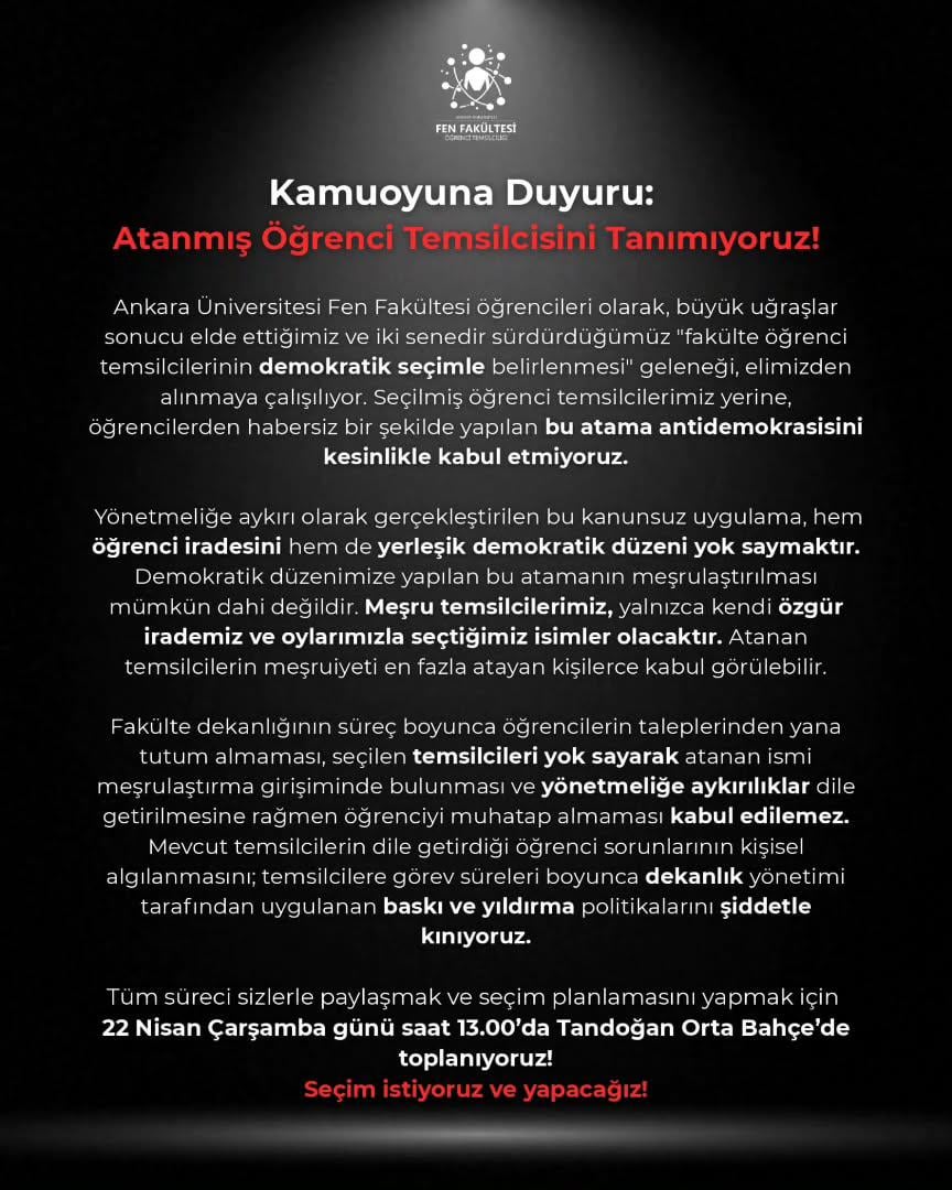 Rappresentante degli studenti fiduciario nominato presso la Facoltà di Scienze dell’Università di Ankara. La Rappresentanza studentesca eletta invita gli studenti Ankü a Tandoğan Orta Bahçe mercoledì alle 13:00.