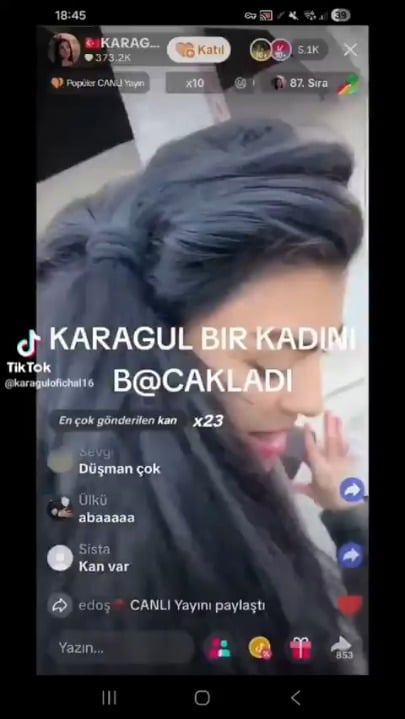 Bu kadın arada tiktokta karşıma çıkıyordu,aslında komik videoları da vardı tiktokta bir sürü popüler ses ona ait,bi ara çocuklarını almışlardı elinden fln ama canlı yayında adam bıçaklamak da nedir amk