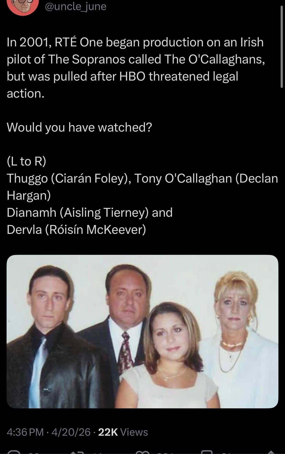What’s the official line the church is taking on the O’Callaghans? It’s just that the Sopranos takes up most of my day and I like a bit of Love and Hate in the evenings. I don’t know if I can devote myself full time to the oul O’Callaghans.