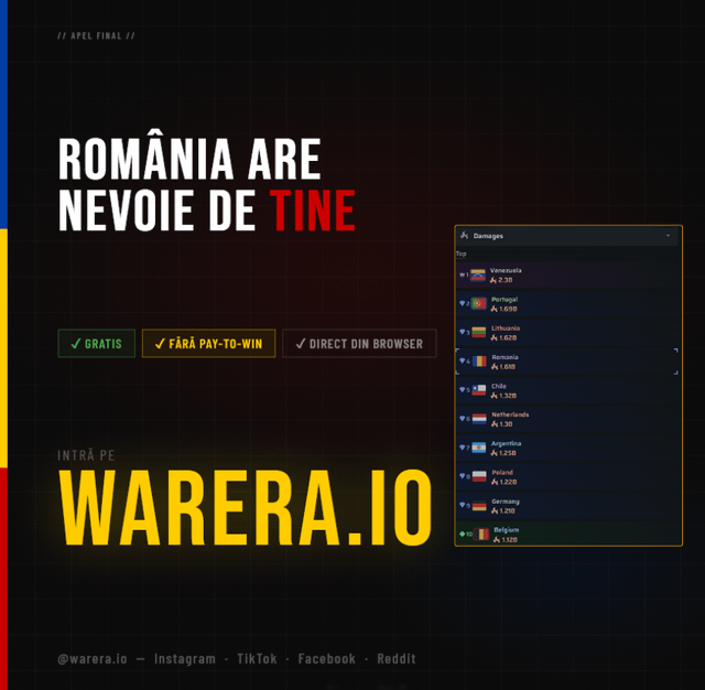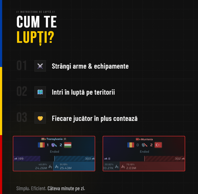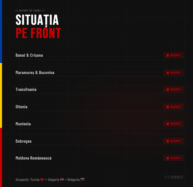 Il motivo per cui sto postando qui: c’è anche una comunità rumena attiva nel gioco e se vuoi giocare sotto la bandiera rumena, ti diamo il benvenuto a braccia aperte. Siamo fratelli e il tuo posto è con noi. Al momento la Romania è occupata da Turchia, Ungheria e Bulgaria e abbiamo bisogno di tutte le persone attive per cambiare la situazione.