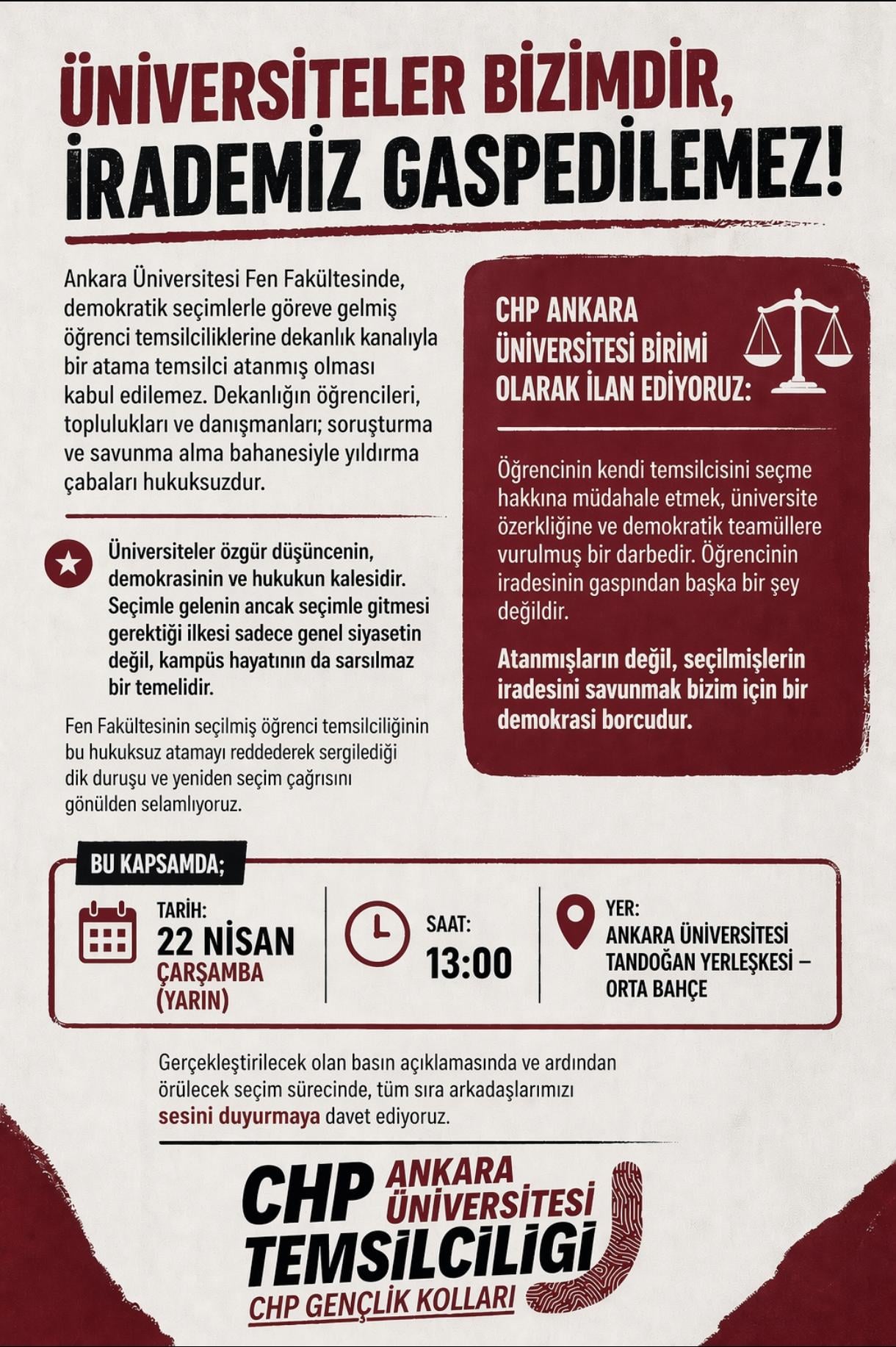 Dopo la nomina di un rappresentante fiduciario degli studenti presso la Facoltà, la rappresentanza dell’Università CHP di Ankara ha sostenuto il comunicato stampa e l’appello elettorale della rappresentanza eletta della Facoltà di Scienze. Ci incontreremo domani alle 13:00 a Tandoğan Orta Bahçe.